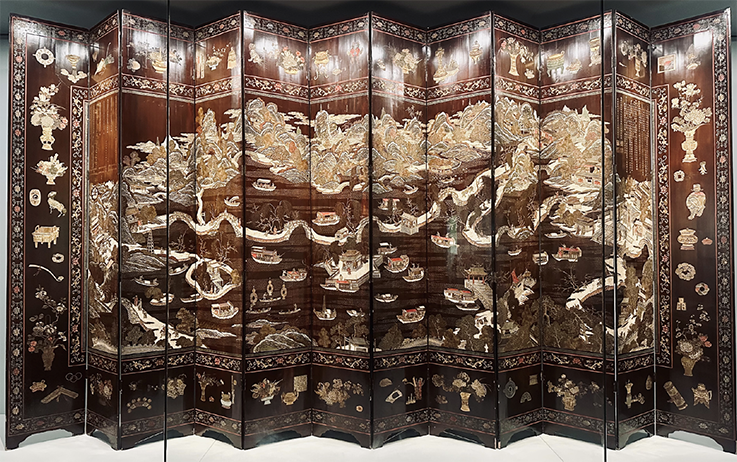 The westward transmission of Chinese kuancai lacquer screens began as early as the Ming Dynasty. After being introduced to Europe, these screens were named “Coromandel” screens. The term “Coromandel” originally referred to a region on the southeastern coast of India. As this area served as a transit hub for East-West trade at that time, it concentrated together various goods from China, including kuancai lacquer screens. This situation led to the name becoming a synonym for Chinese kuancai lacquer wares. This kind of screen was highly popular among European customers, because it could be folded to save shipping space and costs. More importantly, screens had a range of uses. After arriving at their destination, they could be modified into decorative panels according to the requirements of the collectors and then installed in furniture and interior decorations.