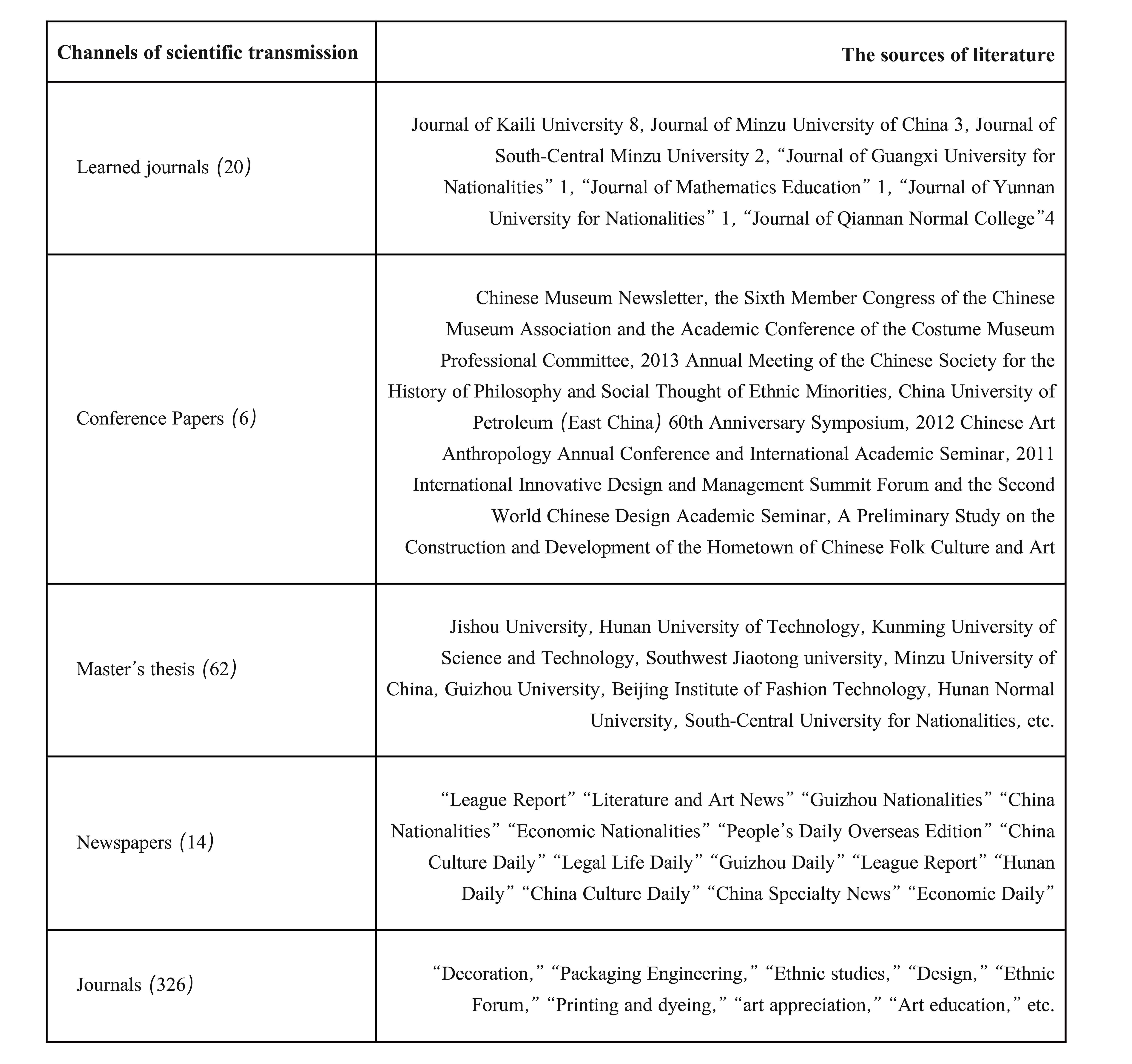 According to a search of “literature source,” periodicals are the most published way of research into Miao silver jewelry, accounting for 76%, followed by dissertations, journals, newspapers and conference papers, among which master’s degree dissertations account for 15%. It can be seen that more and more young scholars focus on research into Miao silver jewelry. Jishou University has become a leading university in the study of Miao silver jewelry, playing a positive leading role. Long Xiaofei and Shi Qunyong first analyzed Miao silver jewelry in 2006, and mainly described the cultural and aesthetic characteristics of the Miao people. Since 2011, a large number of scholars and inheritors have conducted continuous research on Miao silver jewelry [1]. In recent years, the simple research on Miao silver jewelry has gradually shifted to the application and development of Miao silver jewelry’s traditional cultural value in modern life. College teachers and students also continue to participate, which provides a continuous impulse for research into Miao silver jewelry. It not only lays a deeper theoretical foundation for research into Miao silver jewelry, but also encourages young people to consciously assume the responsibility of protecting and inheriting the excellent traditional culture. Table 2 shows the distribution of publishing channels and literature sources of Miao silver jewelry research.