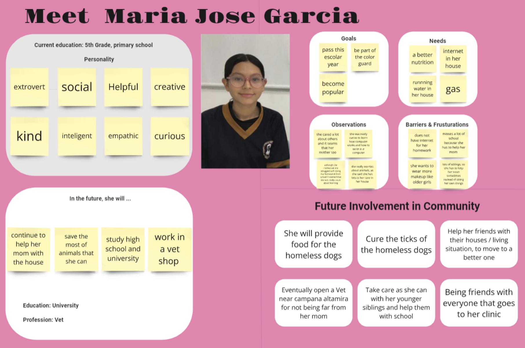 The results of this mapping process yielded revealing patterns (Figure 3). For the personality dimension, five out of six students were described as creative, while four were noted as curious. The group displayed an even split between introverted and extroverted tendencies, with three students characterized as shy and reserved and three others as more social and outgoing. Notably, one student exhibited clear leadership tendencies, marked by extroversion and active efforts to bring friends into the project, but was speculated to complete only high school. Another student, described as polite and ambitious, was viewed as the most likely to leave the community to pursue opportunities elsewhere. In contrast, two students were considered likely to remain in Campana-Altamira despite being projected to complete university studies, citing the desire to stay close to family. Job speculations included one potential entrepreneur, one tattoo artist, one office worker, one veterinarian, and two students with undetermined futures. The mapping also highlighted shared needs among participants, such as daily necessities including water, money, reliable transportation, and improved access to education.