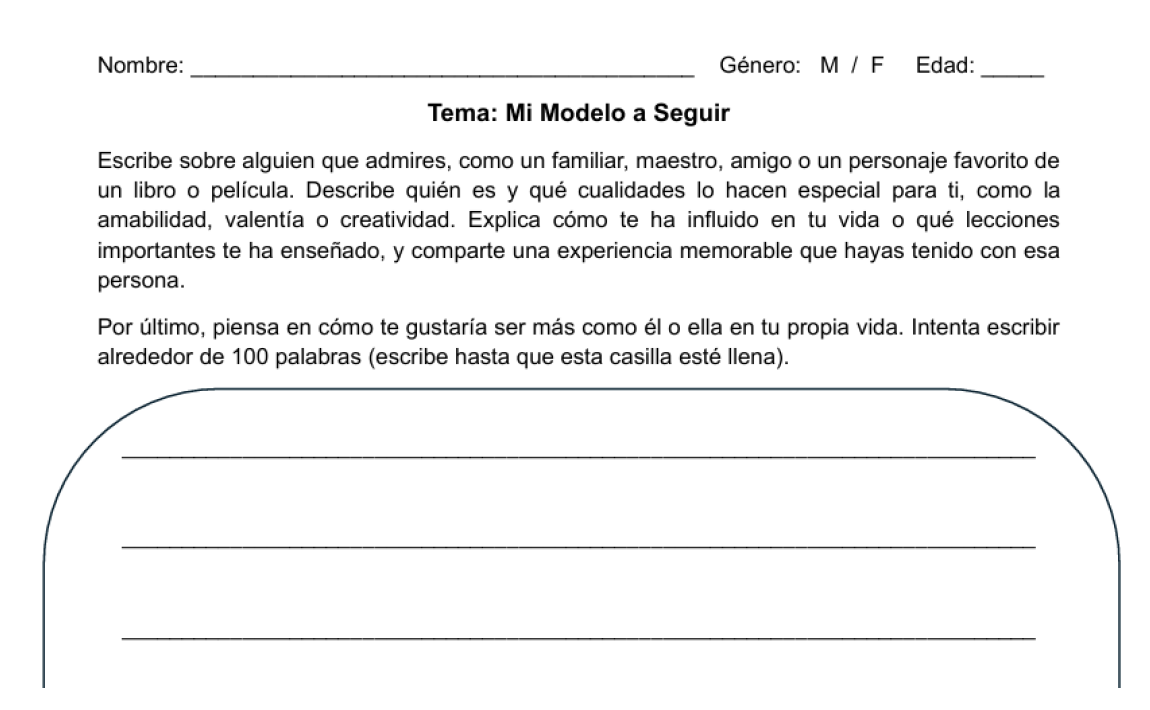 Four months after the initial co-design engagement workshop with the teenagers, we conducted a follow-up visit to their school. This choice of setting was especially important because it placed the students in an environment that felt more familiar and comfortable. Ten students who had participated in the earlier workshop were selected for this next phase. Each was asked to write a 100-word essay titled “Mi Modelo a Seguir” (My Role Model) (Figure 4).
