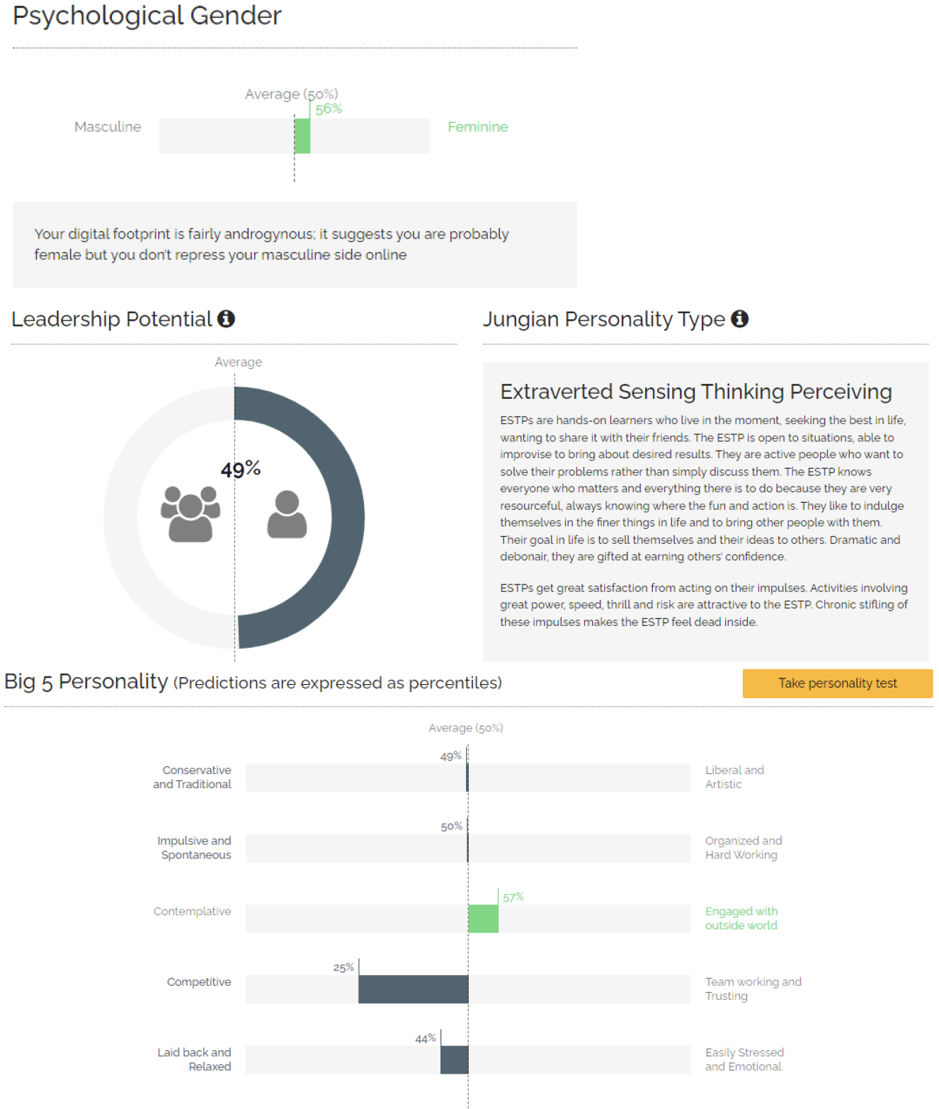 To analyze these texts, we employed the Apply Magic Sauce API developed by the University of Cambridge Psychometrics Centre (Figure 5). Apply Magic Sauce is an automated text analysis tool that predicts various psychological traits based on linguistic patterns in open-ended writing. It provides estimates of Big Five personality dimensions (Openness, Conscientiousness, Extraversion, Agreeableness, Neuroticism), leadership potential, gender expression tendencies, and other variables derived from social media and text inputs. While the model is trained on large-scale datasets and offers valuable indicative outputs, it is important to recognize its limitations, especially given the short length of these essays. Therefore, for this study, we excluded its Jungian personality type outputs, which returned implausibly uniform results (eight of ten students were assigned ISTP). Instead, we focused on more interpretable and relevant dimensions such as the Big Five traits, leadership potential, and masculine–feminine tendency.