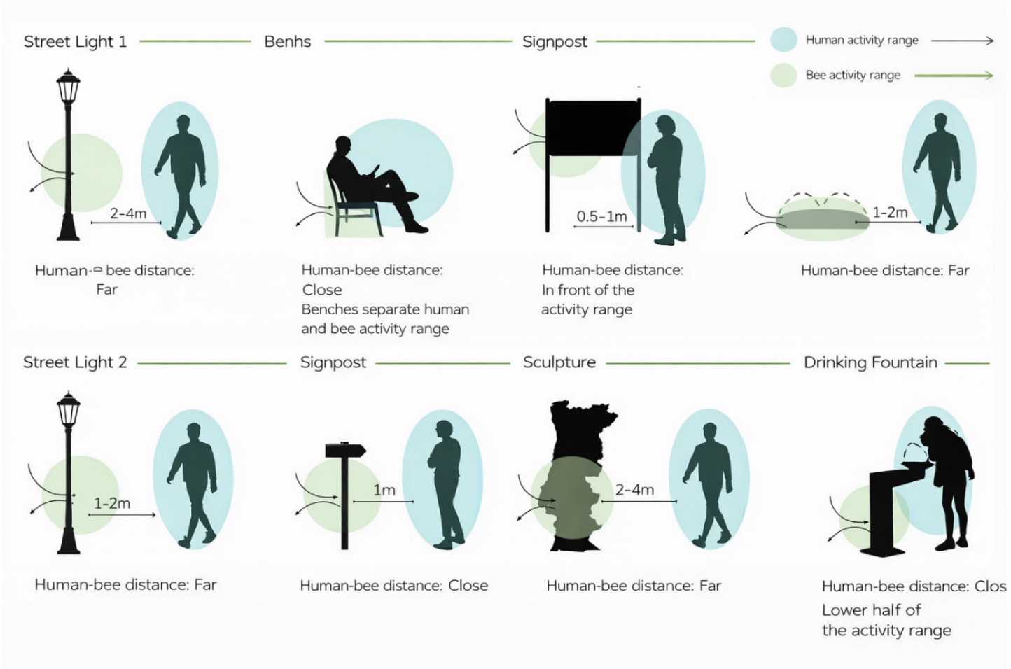 The author conducted a more detailed analysis of the selected public facilities (Figure 10). Human interaction with public facilities determines both the range of human activity and the distance between people and the facilities. Using diagrams, the study defined the zones of human activity and solitary bee activity, aiming to ensure that the bees’ and humans’ activity ranges do not interfere with each other. This research provides guidance and reference for the subsequent development and refinement of the design proposals.