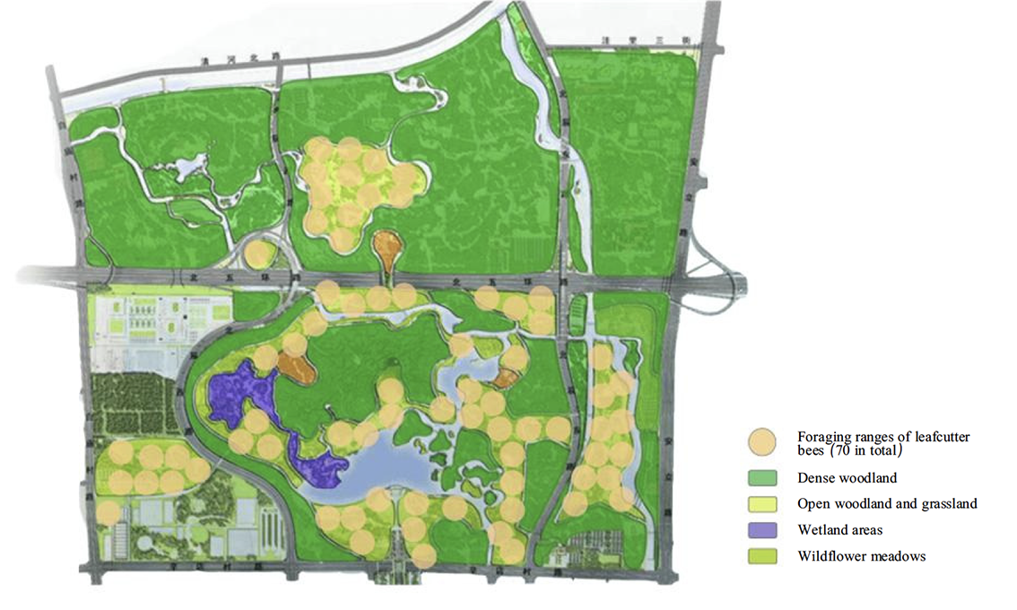 The author estimated the foraging range of leafcutter bees based on the map of Beijing Olympic Forest Park. The park’s vegetation can be broadly categorized into dense forested areas, sparse woodland and grasslands, wetlands, and wildflower meadows. Solitary bees are best suited to survive in the wildflower meadow areas, which can accommodate approximately 70 foraging ranges. Each foraging range requires one to two bee nest points, and the number of potential public facility locations is more than sufficient to support the creation of solitary bee habitats (Figure 12).