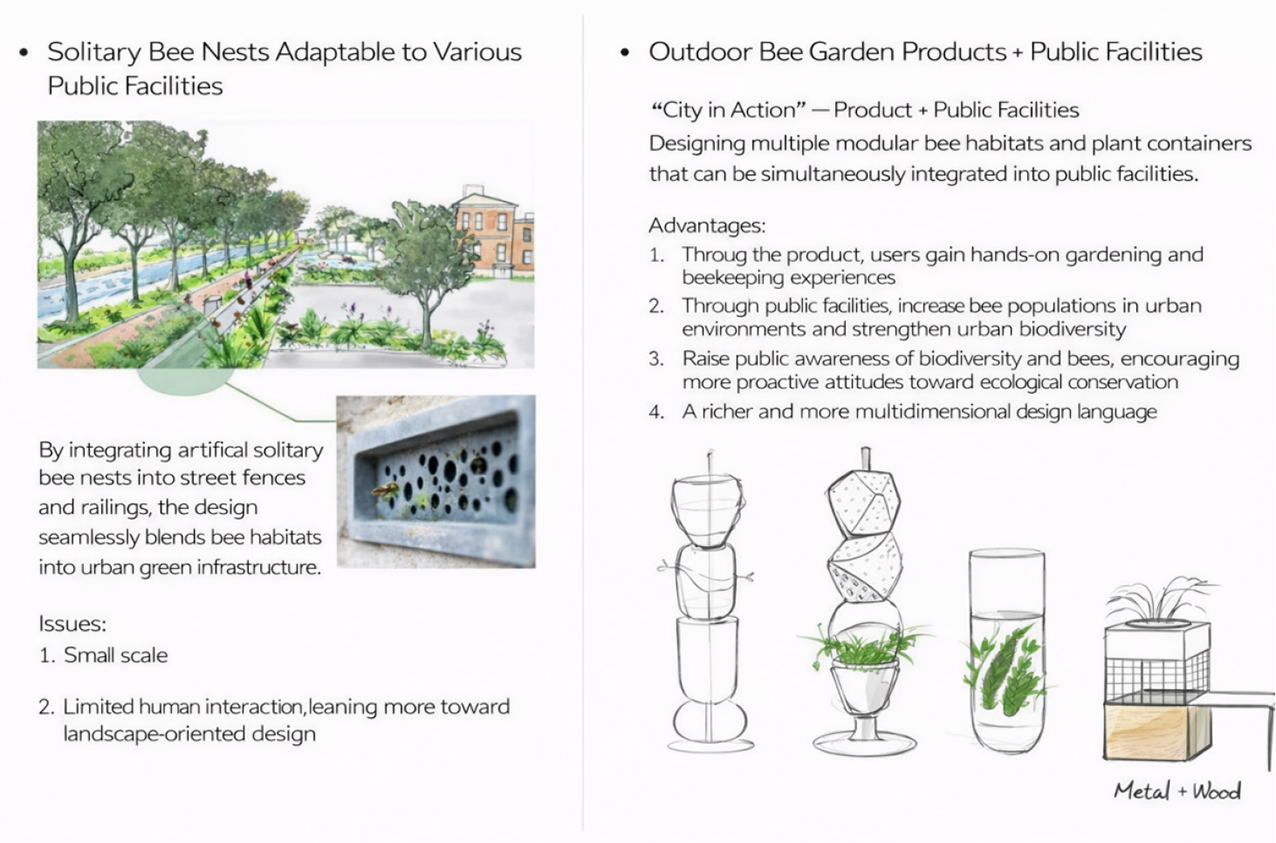 During the preliminary research phase of this project, the author systematically reviewed academic literature and expert studies related to the ecological characteristics of solitary bees, urban biodiversity, and the ecological design of public spaces. By analyzing the work of ecologists and environmental design scholars on solitary bee habitat requirements, life cycles, and survival challenges in urban environments, the key requirements of solitary bees for nest structure, materials, and spatial scale were clarified. At the same time, existing research on ecological infrastructure and public environmental education provided important insights for this project, prompting a shift from single-species protection toward a systematic consideration of coexistence between human and non-human species. These references established the theoretical foundation for defining subsequent design directions and developing design strategies.