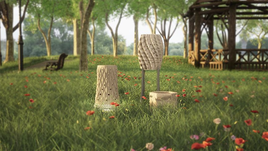 Based on field research and analysis, the design comprises a series of bee nest products in three categories: a standalone bee nest, a bee nest integrated with public facilities, and a bee nest designed for individual users as a horticultural product.