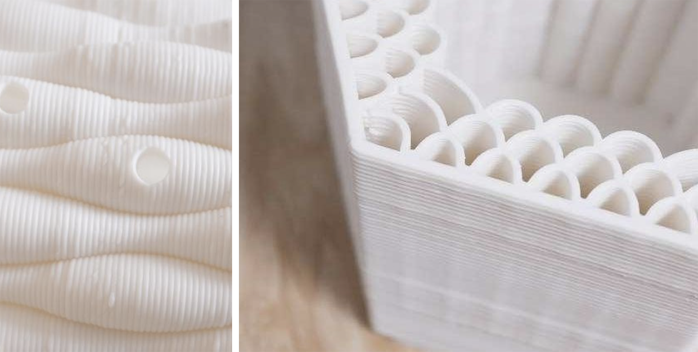 3D ceramic printing builds objects by continuously extruding clay coils through a machine, requiring uninterrupted material flow. As a result, product forms are typically cylindrical, with external form variations achieved through techniques such as parametric design.