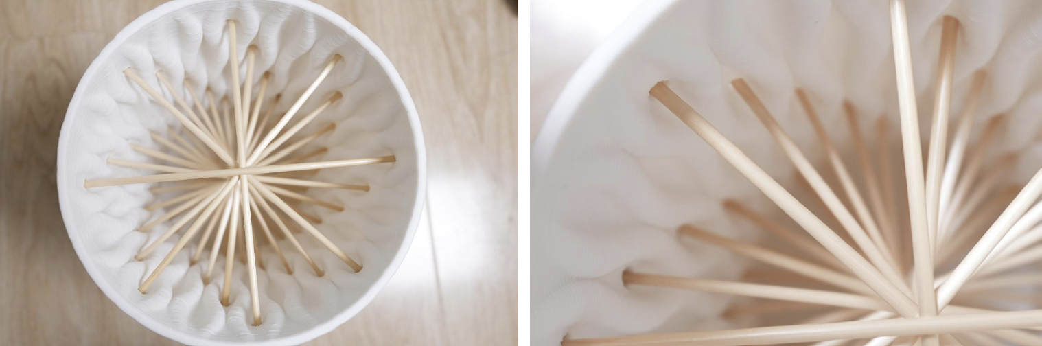 The series consists of three works primarily divided into two structural types. The first type is a hollow, capped cylindrical form, with perforations on the exterior surface into which natural wheat straw tubes are inserted to simulate the natural environment. This design aligns with the natural preferences of solitary bees, providing suitable reproductive nests. The second type is a bottom-sealed basin form that does not require additional materials; the vertical tubular structure is formed directly through printing, making it more compatible with the fabrication process. However, this approach has the drawback of water accumulation and is therefore more suitable for semi-open balconies or outdoor spaces with a canopy (Figures 20a, 20b, 21, and 22).