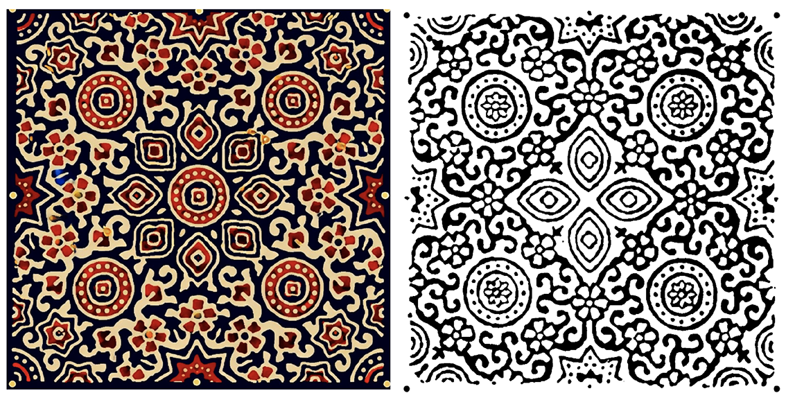 This exploratory motif analysis has various significant limitations. The six motifs are not a representative sample and might not reflect the entire variety of Ajrak designs; other designs might exhibit other proportional characteristics. In addition, we obtained our measurements based on 2D digital images; pixel rounding or perspective errors might have slightly influenced the ratios we estimated. According to one of the artisans, machine-printed reproductions do not have the human touch; likewise, digitized photographs have the potential to add small geometric errors (folding, camera angle, image resolution).