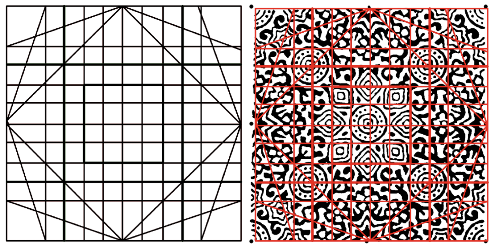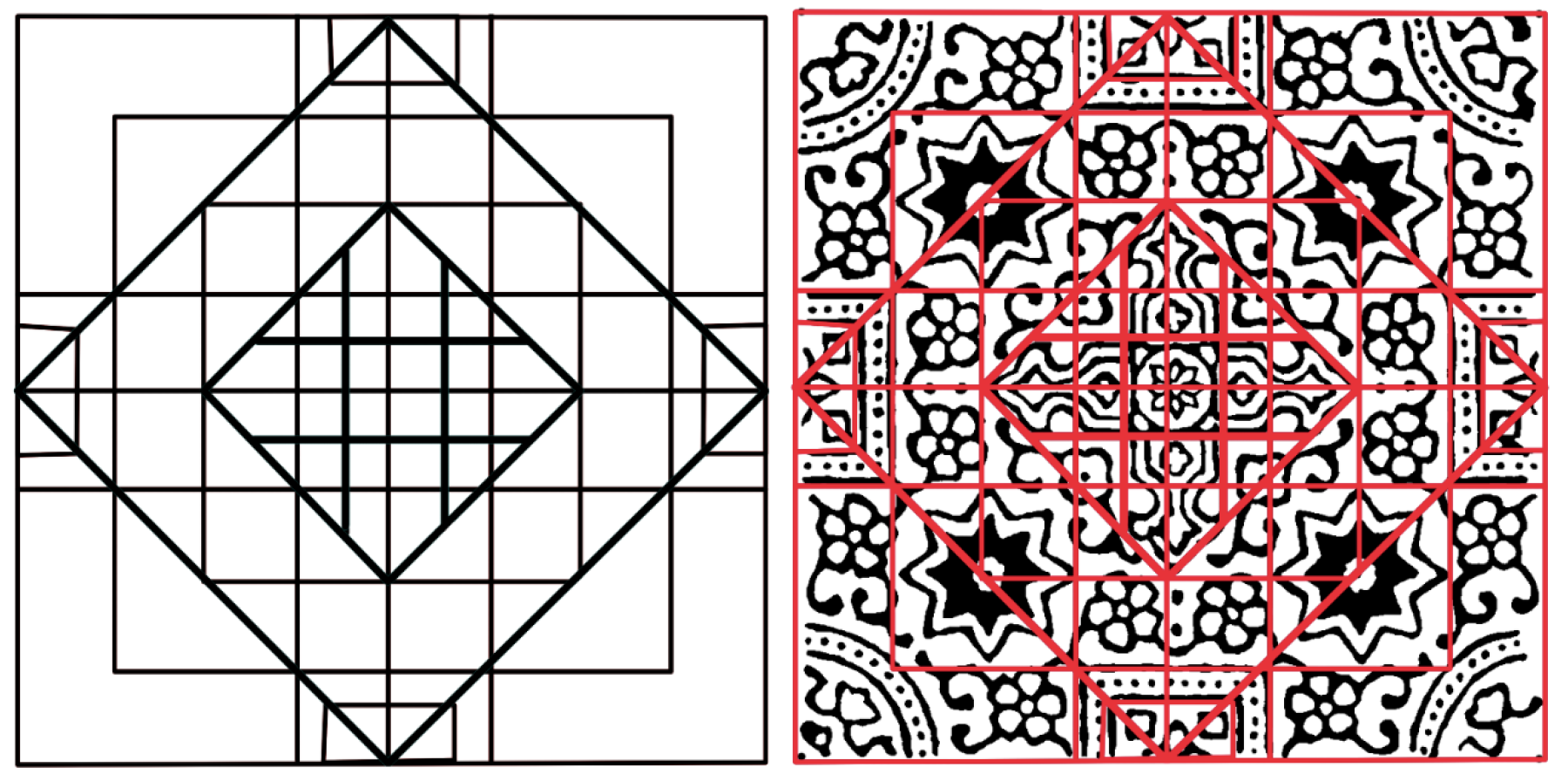 Quantitative measurements were obtained from scaled drawings to test the proportional relationships with each motif geometry. The authors measured the important dimensions of the geometric construction in pixels using the Photoshop measurement tool, and the calibrated grid converted the pixel measurements into a consistent unit in the real world (for comparison with other measurements). Examples of measured structures include the diameter of a central motif, the spacing between the centers of repeating patterns in a border strip, the length and width of the petals of a star, and the distance between concentric patterns. Each motif was tabulated in terms of its measures. The proportional ratios were computed using pairs of dimensions that illustrated an aspect of the part-to-part or part-to-whole relationships. The examples show the ratios of the outer circle diameter of a motif to the diameter of an inscribed star and the ratio of the repeat length of the border pattern to its height.