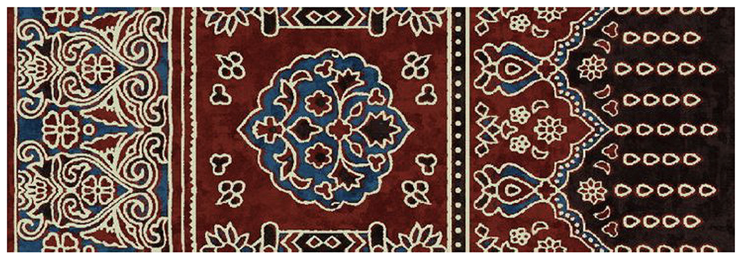 Ajrak is historically considered one of the oldest existing textile art forms in South Asia [2]. Other historians date it to the Indus Valley Civilization (3rd millennium BCE), with the trefoil-patterned shawl around the Priest-King statue of Mohenjo-daro suggesting possible evidence of antique block printing in the Ajrak style. The history of Ajrak manufacturing across centuries prospered along the Indus River, extending to other areas, such as Kutch (Gujarat) and Barmer (Rajasthan). Patterns and applications may have changed; however, the principles of the craft, the carefulness of handwork, the application of natural dyes, and the insistence on harmonic design have remained true to the generations. This has been made possible by the resilience of Ajrak as a textile and an institution of culture [3].