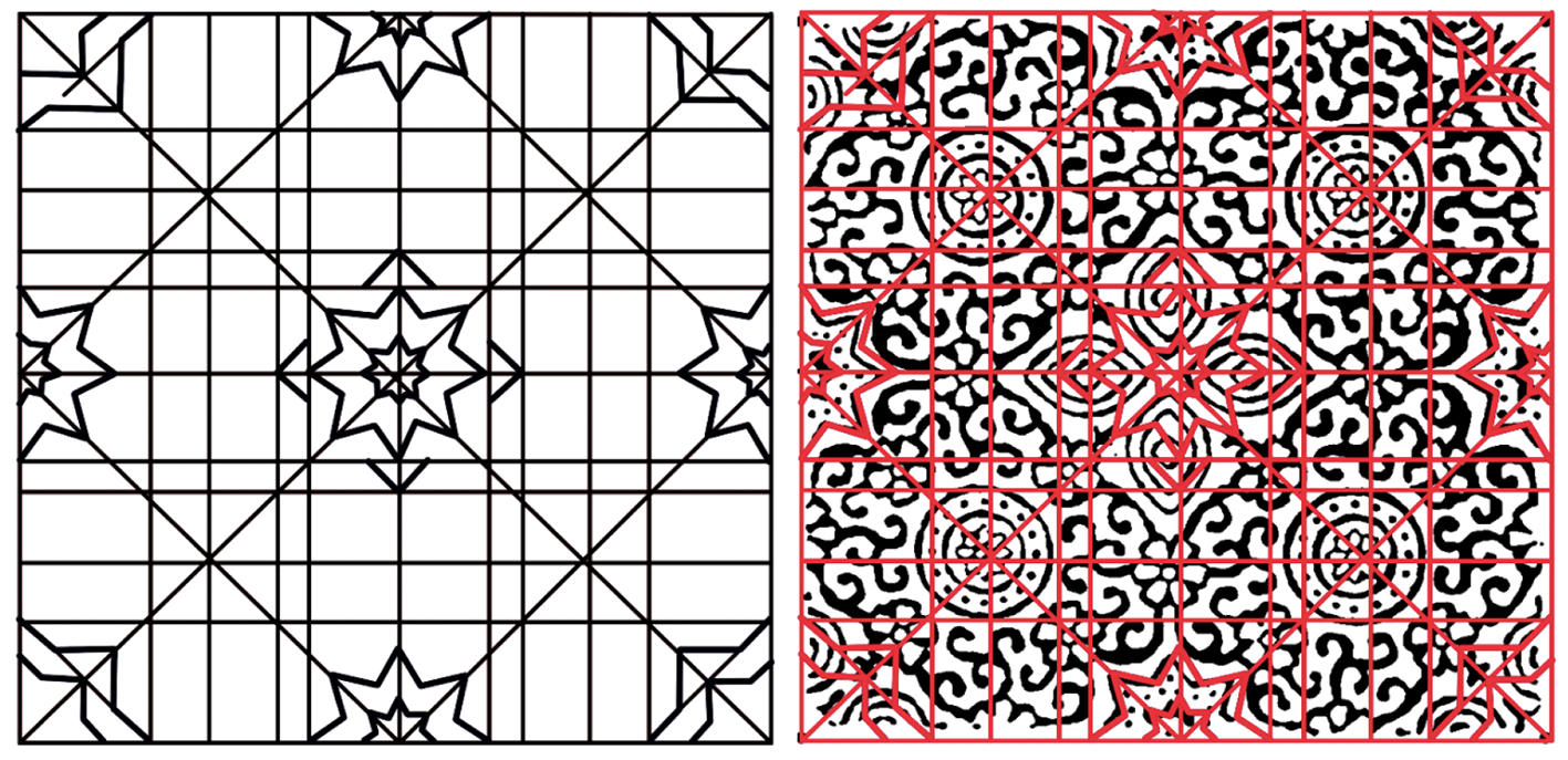 For example, when a motif had an octagonal star, an octagonal shape or star polygon like the Riyal motif (Figure 3) would be drawn to fit the outline, and where a floral motif was used, a corresponding circular guide would be superimposed to measure its radius. These digital tools allowed the analysis to appear as though it were a manual drafting technique, except that it was now possible to zoom and have the accuracy of on-screen measurement. The original image was not obscured by the overlays; thus, it could be checked in terms of alignment and accuracy with the real motif until working in layered files. The digital overlays also allowed testing transformations, including copying and rotating units of the motifs to experiment with symmetry.