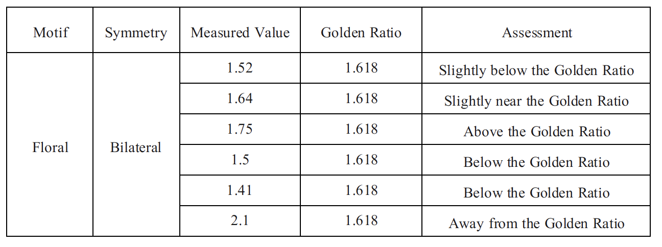 The floral bilateral motif exhibits partial proximity to the golden ratio, with one measured value closely approximating φ, while the remaining values deviate from the reference proportion (Table 4). Values within approximately ±0.1 of the golden ratio (1.618) were classified as slightly nearby.