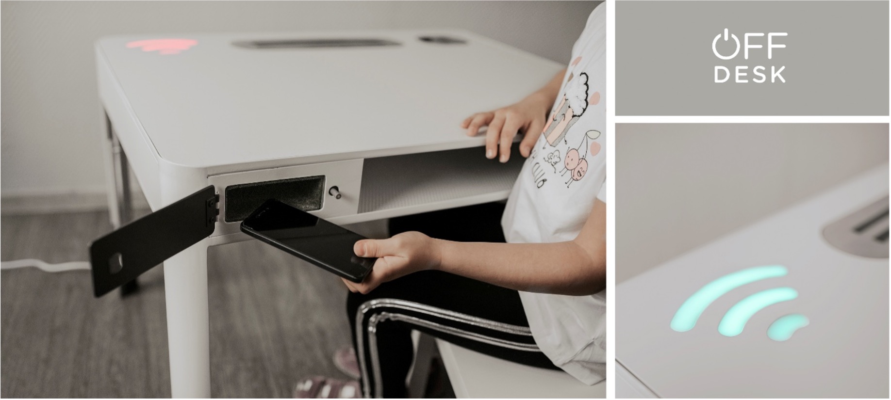 The relationality manifested in MDS projects—understood primarily as an exploration of the bonds between humans and their surroundings—does not limit itself to the natural world. Equally important are inquiries into our relationships with technology. An example of such an approach is Off Desk [48], an interactive school desk with an audio-visual system that encourages students to set aside their mobile phones during class time (Figure 11). The object features a built-in Faraday cage designed to store smartphones during lessons. Since it blocks access to external electromagnetic fields, a phone placed inside becomes practically non-functional. In this case, interactive technologies are used to foster conscious distance from the digital environment. Users’ mindfulness and intrinsic motivation are stimulated through light and sound signals generated by the object. A backlit Wi-Fi symbol on the desk’s surface, glowing in a specific colour, indicates a request to put the phone away. As a reward for completing the task, the desk generates a pleasant sound (e.g., birdsong, applause), which can be personalized. Simultaneously, the Wi-Fi symbol changes to a light blue colour.