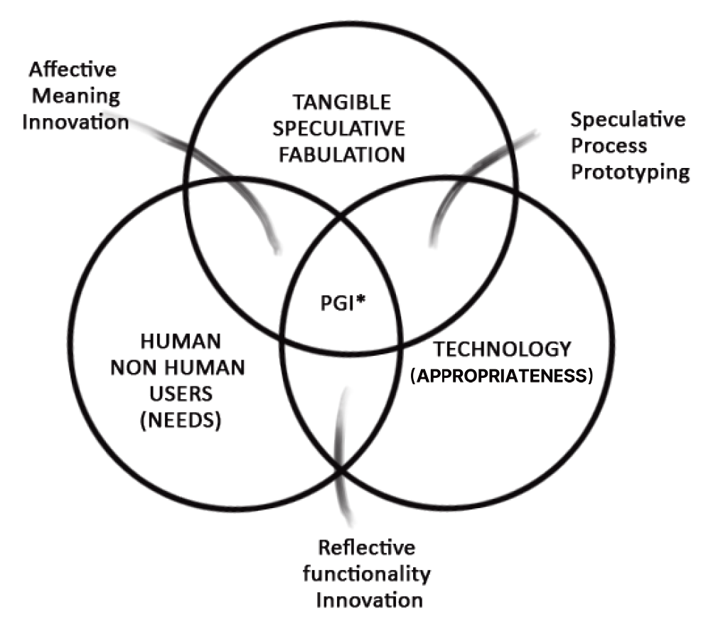 The prototypes presented in this article can be understood as post-growth innovations. Rather than reinforcing the traditional ties between progress and economic growth, they demonstrate how innovation can be directed toward supporting collective well-being, environmental responsibility, and more inclusive forms of technological engagement. They take the peculiar form of tangible speculative fabulations and serve as catalyst for promoting shifts in worldview and society. The discourse on potential paths of development, agency, and autonomy unfolds here outside the frameworks of global technological systems and market efficiency. In the MDS approach, post-growth innovation is situated at the intersection of the following domains: the desires of humans and non-humans, the capacities of available technologies as affective tools, and speculative material fabulations that give shape to possible alternatives (Figure 13).