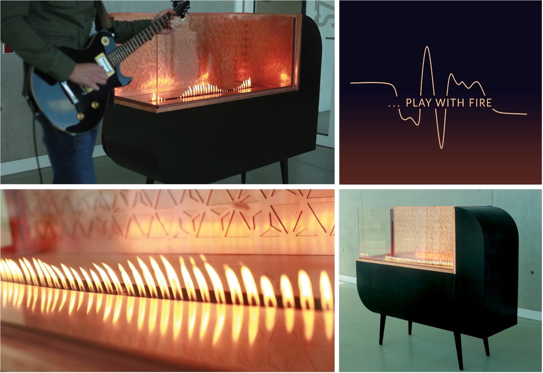 Another project with a similar affective tone and social mission is Play with Fire (Figure 4). Aleksandra Łukasik [40], drawing on the symbolic and cultural archetype of fire—particularly its role in rituals of passage, purification, or community—designed a singular fireplace for celebrating sensory rest. Combining the aesthetic-functional qualities of refined furniture, a hearth, and a musical instrument, it invites users to mindful contemplation of music accompanied by a fiery spectacle. A characteristic feature of the object is the flame line embedded in a glass chamber along the longer axis of the furniture. This element is part of a built-in gas installation connected to a speaker membrane. Users can activate soundtracks via a music-generating app, or they can create them using an attached musical instrument. The dynamics of the musical piece and instrumental changes influence the shape and intensity of the flames. The fire can change its appearance—from a harmonious line to dramatic leaps reaching several dozen centimetres. The object’s novelty lies in its therapeutic dimension, promoting slow life. Mindful observation of the domesticated element, reinforced by acoustic impulses from musical pieces, fosters an atmosphere of calm and sensory immersion.