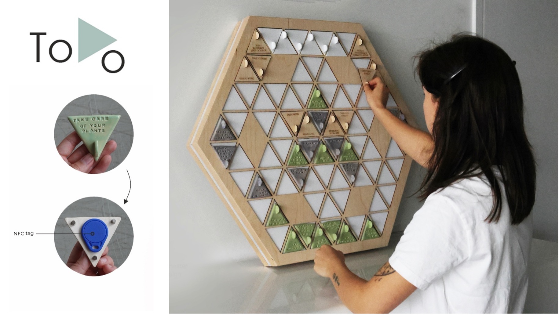 A different, more complex therapeutic influence is represented by the prototype To Do, created by Maja Wojciechowska [41]. This is a functional object dedicated to people experiencing depressive episodes, for whom completing basic daily activities poses a significant challenge (Figure 5). The object takes the form of an interactive board designed to motivate users by encouraging them to track their progress through a custom interactive system. The prototype consists of a hexagon-shaped panel divided into triangular fields, where users can attach matching ceramic tiles labelled with specific tasks (e.g., eat breakfast, brush teeth, call a friend). The gesture of attaching each tile is recorded via RFID tag technology, accentuated by appropriate field lighting. The daily mosaic of completed tasks is visualized in a custom app, allowing the user to monitor progress and enrich the recorded patterns with new challenges.
