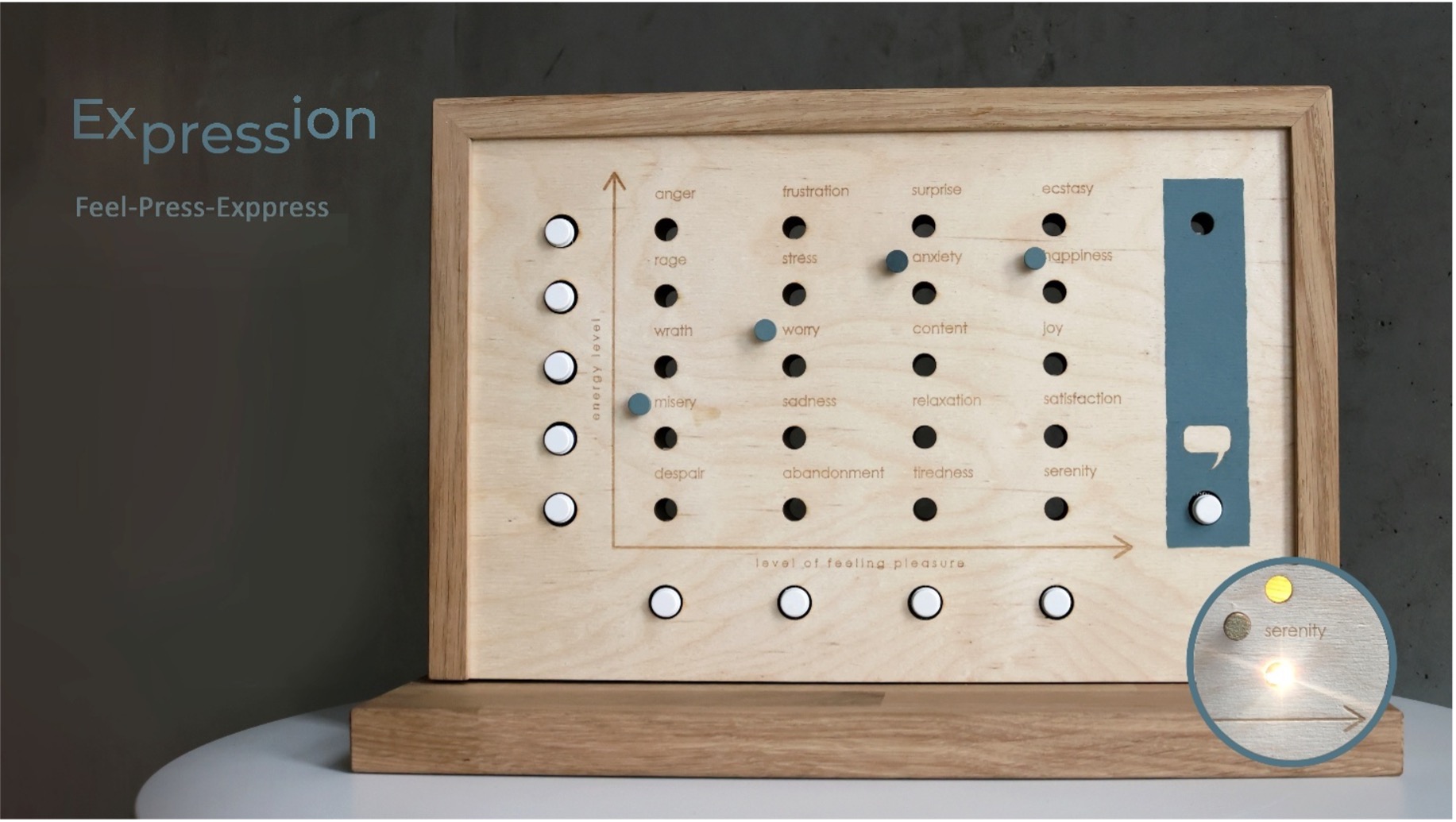 Another interesting object for self-observation is Expression by Aleksandra Czechowska [42]. Inspired by the game Battleship, it supports real-time recognition, observation, and expression of emotions (Figure 6). Designed to encourage attentive dialogue, it promotes honest communication and can be an effective tool for psychotherapists. A portable wooden screen with an imprinted emotion grid, it allows users to indicate the feelings evoked during a conversation by pressing one of several buttons. Each button illuminates the corresponding emotion point, visible to the conversation partner on the other side of the screen. Additional magnetic tokens enable the visual, turn-based recording of emotional states experienced by the interlocutors during the exchange. Expression illustrates the affective landscape of a conversation between close individuals, helping them name affective states and observe their emotional sources.