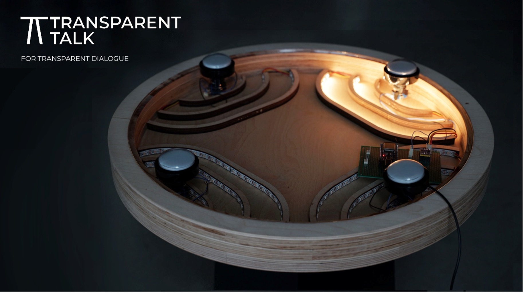 Interpersonal dynamics are moderated differently in Transparent Talk by Alicja Zawadzka [43]. Her prototype is a table designed for inclusive conversation, ensuring that each participant has the opportunity to speak (Figure 7). Users interact with the surface via buttons embedded in the tabletop. Each press, signalled by a lit-up area, indicates the intention to speak. Speaking time is measured by the duration of the light signal and is equal for all users. The table records the sequence of button activations, creating a speaking queue and assigning time accordingly. When the moment arrives, the LED strip at the relevant person’s position lights up, symbolically giving them the floor. Light acts here as a moderator—it organizes the rhythm of conversation and highlights the transparency of the process, opening space for every voice. The action scenario can be flexibly adapted depending on the needs of a given discussion and its participants. An important feature of the project that enhances its post-innovation dimension is the ability to visualize the percentage share of each participant’s speaking time. Transparent Talk reveals who dominated the conversation and who had only a minimal presence. This serves as an invitation to self-reflection and conscious inner transformation.