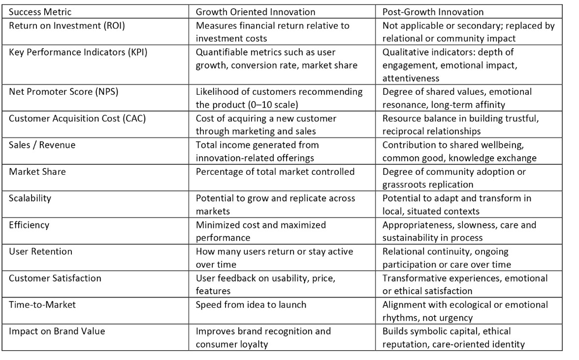 Unfortunately, many funding bodies, competitions, and innovation programs remain tightly bound to this model of innovation. As shown in the table comparing success indicators of growth-oriented innovation and post-growth innovation, dominant mainstream frameworks tend to favour rapid development, technological novelty, and market readiness—while neglecting slower, more relational design modes that focus on care, situated knowledge, and long-term cultural transformation (Table 1). As a result, alternative forms of innovation—those rooted in pro-social action, critical reflection, or long-term metamorphosis—are often classified as marginal or unproductive.