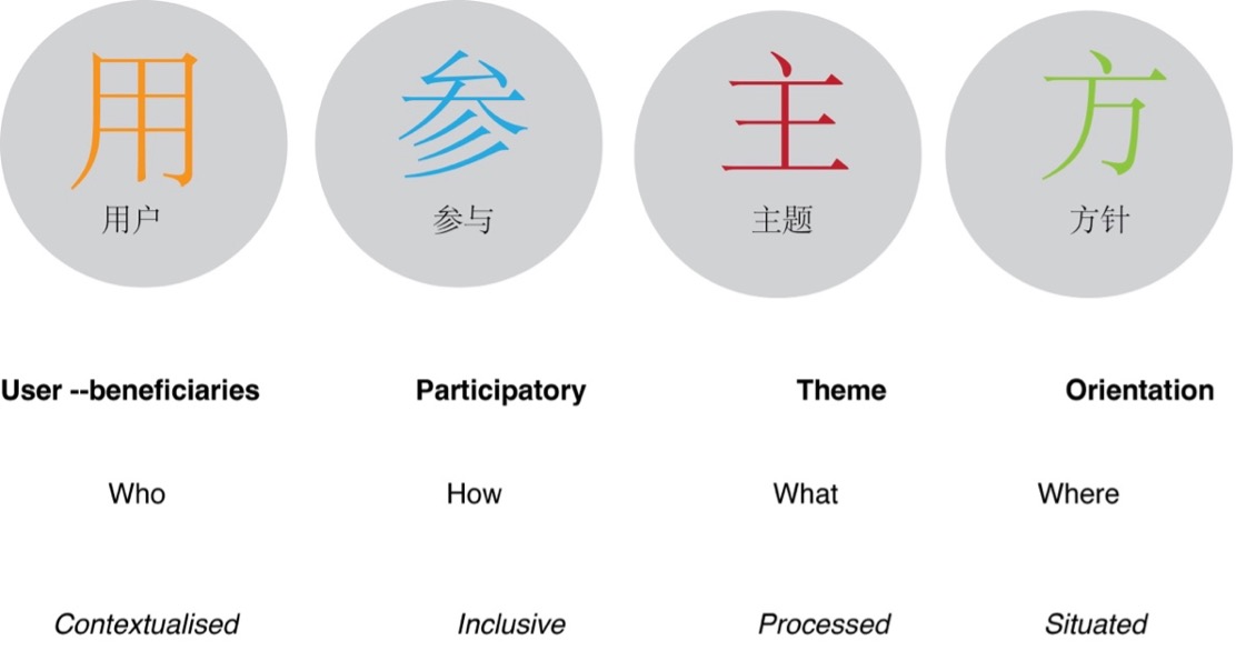 Same as other exiting framework- RE-AIM [37], he strategy involves using the abbreviation (缩写) and the homophones (谐音) of Chinese characters to encapsulate the function of the framework. The “Who-How-What-Where” mnemonic is often employed as a starting point for basic project inspiration, while the Chinese abbreviation “用参主方” is derived from the characters 用户 (user), 参与 (participation), 主题 (theme), and 方针 (Orientation), connoting the main ingredients of a recipe. This can be further shortened to “参方.” From a traditional Chinese medicinal perspective, these characters represent the ingredients for a prescription, indicating paths for diagnosis. This method of identification renders the framework more memorable, user-friendly, and easily diffusible, a diagnostic tool that appropriates Chinese cultural and linguistic elements to help identify problems.