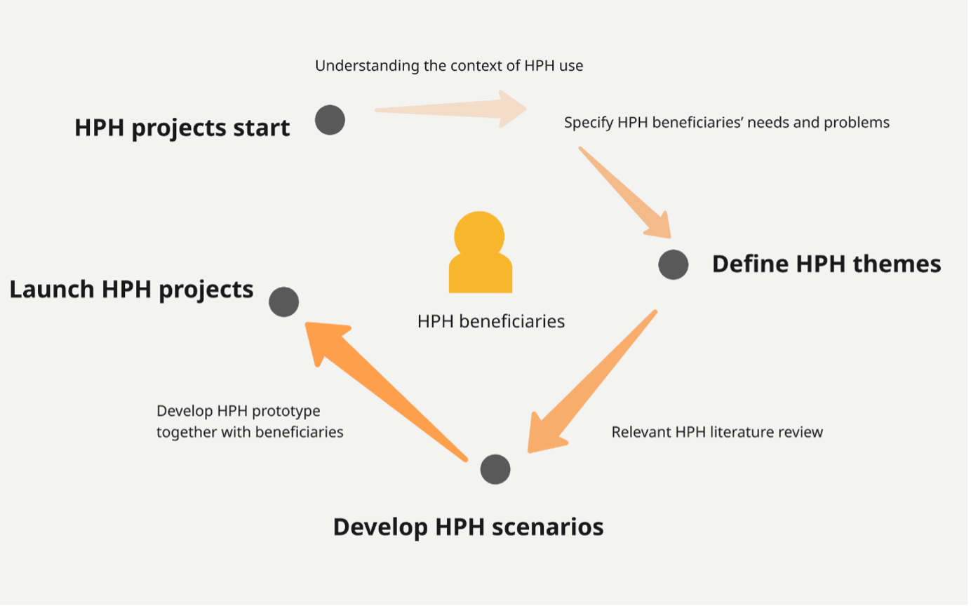 Based on the design thinking process review (Figure 7), the practice process map—a designerly way of doing HPH— (Figure 11) was generalized. When an HPH project starts, the first step is understanding the context of HPH use and specifying the focus group’s needs and problems, allowing them to define exactly what they should promote as the theme of the HPH project. The second step meant conducting relevant HPH literature and project reviews, then developing prototypes and scenarios together with beneficiaries to identify adaptive solutions or possible health promotion approaches. Finally, the HPH project could be launched and implemented into other similar contexts, communities, or focus groups.