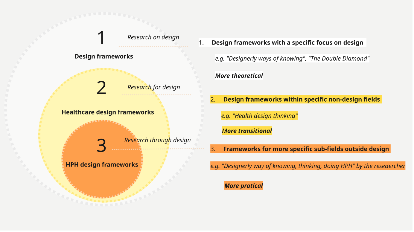 This category of frameworks fits into “research through design,” offering non-design experts an alternative—designerly approach to conducting research or practice through design methods. My set of design frameworks for HPH falls within this third category. These HPH frameworks offer more practical guidance in terms of methodologies, practice processes, and strategies.