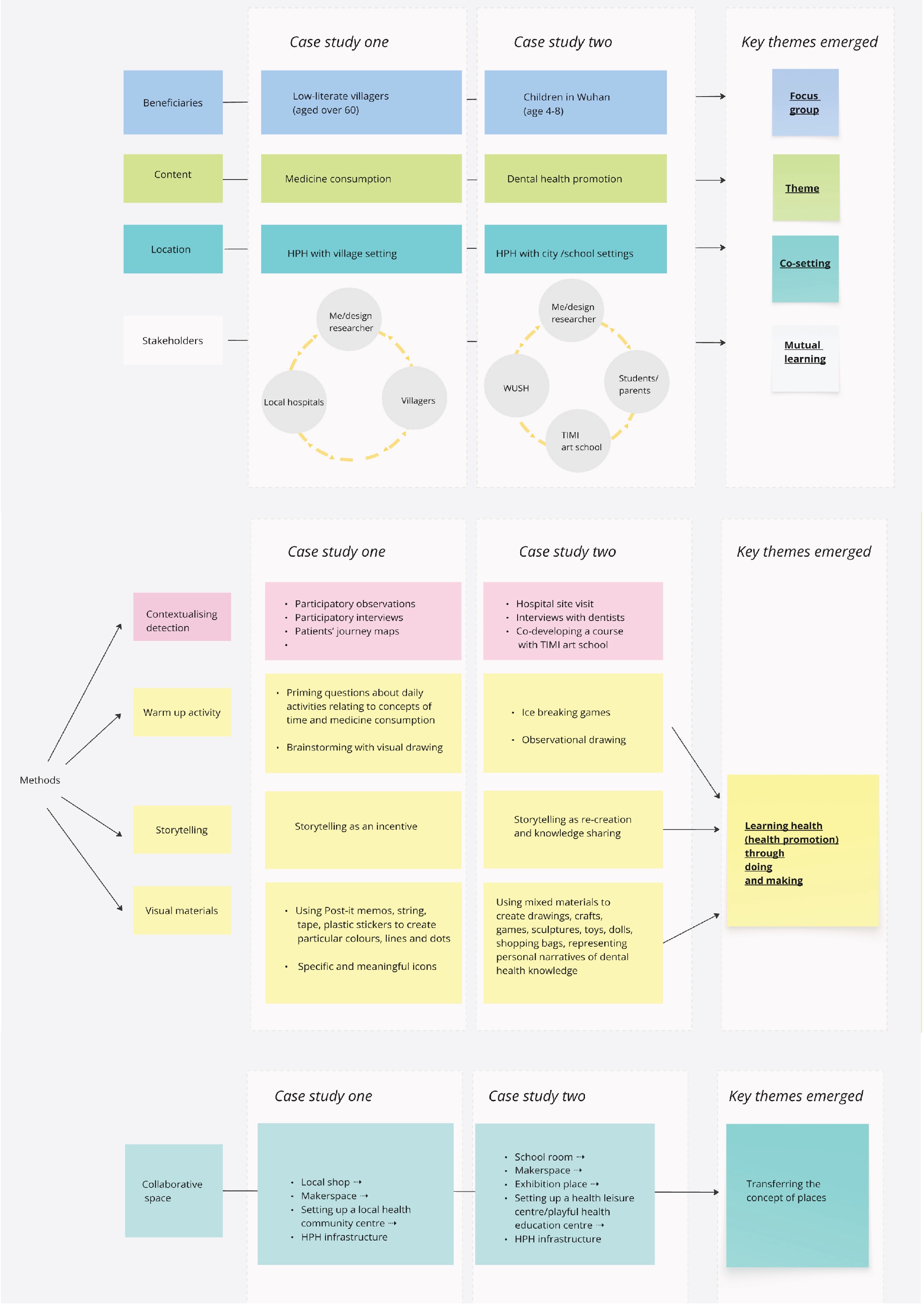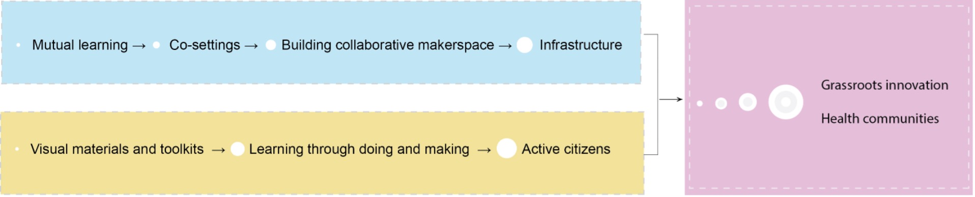 Figure 1 details the specific methods employed, and through a comparative reflection on the case studies, four thematic variables emerged: focus groups, co-settings, mutual learning, and visual materials which enhance learning experiences. Figure 2 demonstrates how these key thematic variables act as transitional threads from micro elements to macro infrastructure. Mutual learning between HPH organisations and focus groups encourages organisations to identify the specific health promotion needs of the focus groups. This is then followed by the creation of collaborative settings and makerspaces. It is here that focus groups can learn through hands-on activities using the visual materials and toolkits developed by HPH organisations based on findings from the mutual learning process. The makerspace may be a temporary public area for hosting health activities in partnership with external collaborators, but it can also serve as a permanent health centre where local residents engage in health education: leisure activities, health exhibitions, games, workshops, reading clubs and lectures. Combining traditional passive learning methods through text and media with such active learning through group-based hands-on activities, aims to promote active, healthy citizens, eventually establishing health community initiatives which allow communities to manage their own health.