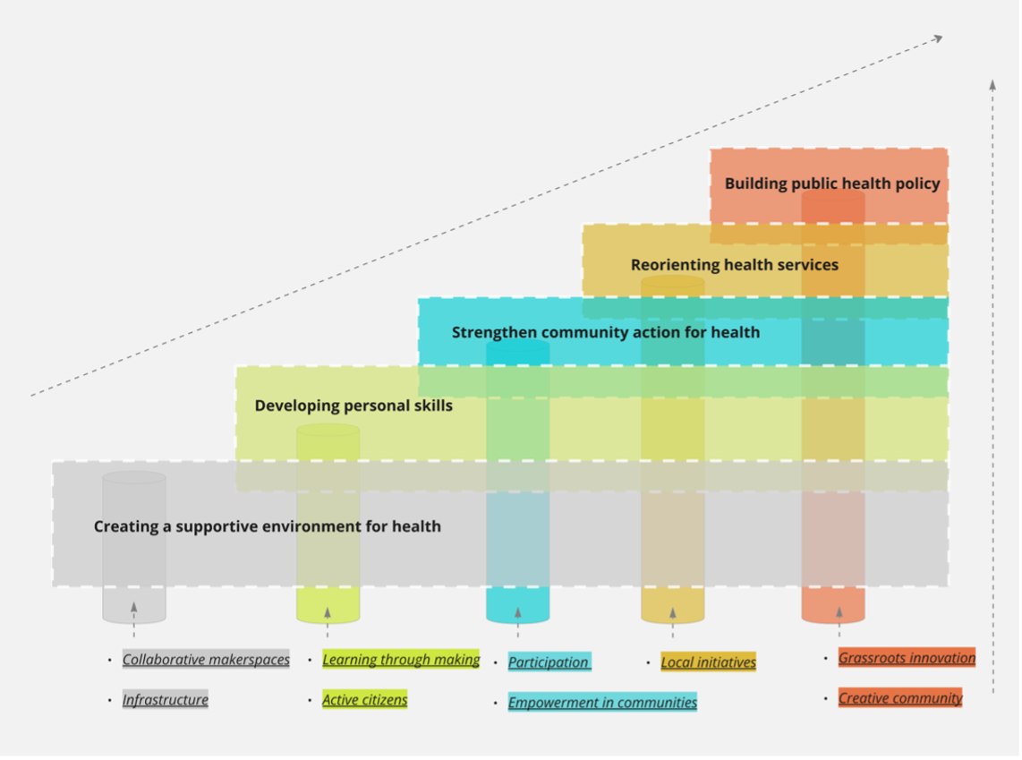 This transitional process offers a bottom-up strategy, distinct from the top-down iterations of WHO’s five actions [23] (Figure 3). The researcher reorganized these five actions using design scaffolding (Figure 4) based on the key themes that emerged from his reflections on theory and practice (Figure 1 and Figure 2). This new approach begins with establishing a supportive environment for health through collaborative makerspaces and building infrastructure. Within this setting, the next step is developing personal skills by fostering active citizenship and promoting learning through practical, hands-on activities. Participation, engagement, and empowerment can strengthen community-driven health initiatives and lead to a reorientation of health services. Ideally, these processes will ultimately contribute to the reformulation of public health policies through grassroots innovation and the creation of engaged communities.