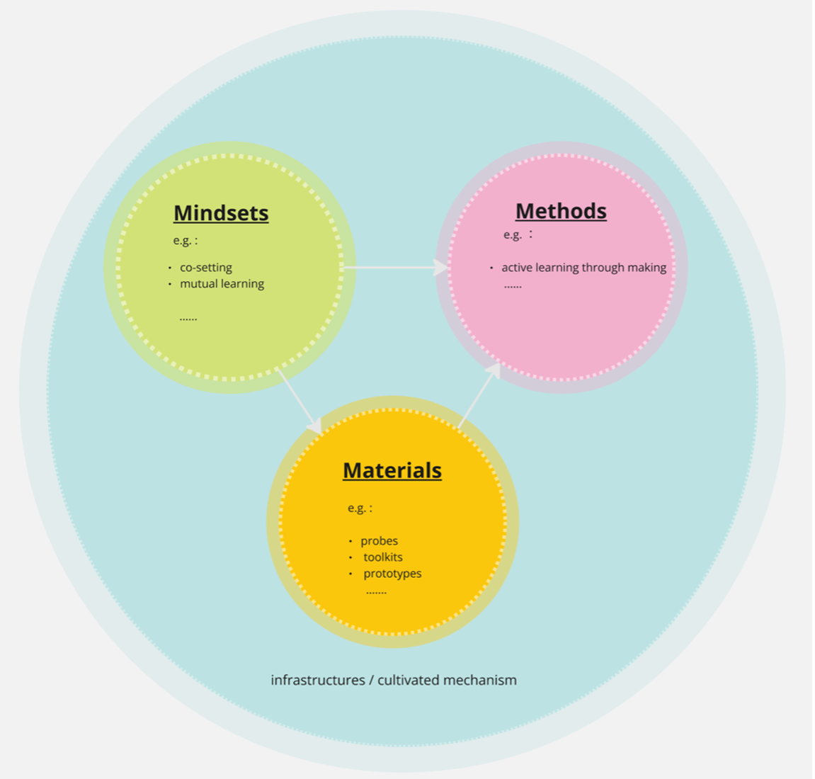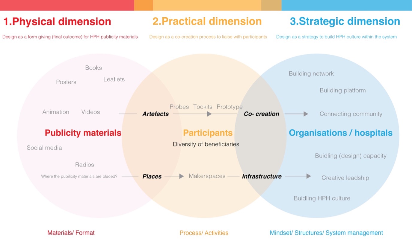 The third space – the strategic dimension – considers design as a strategy for establishing an HPH culture within the system. While probes, toolkits, and prototypes from the second dimension can be considered learning materials for co-creation, the concept of co-creation may be further extended to encompass the creation of networks and platforms connecting communities. If the makerspace from the second dimension is infrastructure, it may also contain the development of capacities and HPH culture. These three dimensions operate in parallel rather than hierarchically, maintaining equal importance with different areas of focus. They encompass three distinct dimensions: