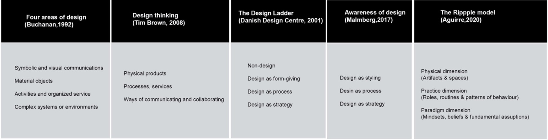 Figure 6 selected 5 types of design thinking epistemology: Four areas of design from Buchanan [24], design thinking from Brown [25], the Design ladder [26], and two design models from doctoral research- awareness of design [27], the Ripple Model [28]. The review of these frameworks offers a foundational understanding of how design thinking can be comprehended and segmented, revealing the epistemology of design thinking.