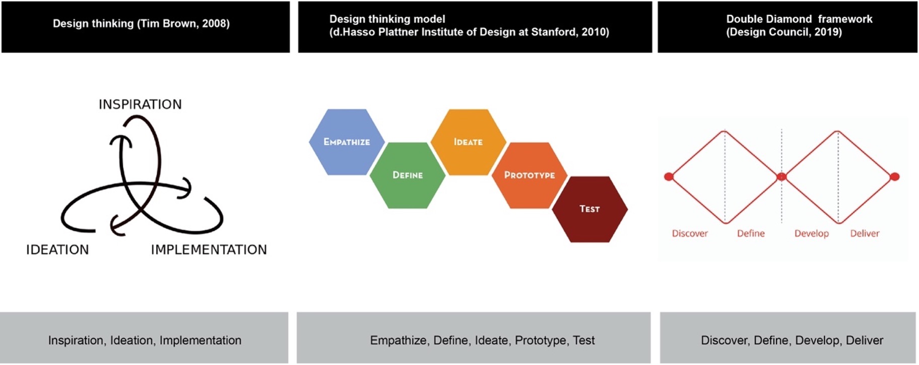 Once we understand what design thinking is, the next stage is to explore how the process works. Given the complexity and abstract nature of design processes, particularly for non-design experts, visual diagrams prove to be valuable tools in illustrating these processes [29, 30], hereby facilitating effective communication of design thinking principles to a diverse audience [31]. The three models depicted in Figure 7 each provide a unique visualization of design thinking processes: “Inspiration, ideation, implementation” from Brown [32]; “Empathize, define, ideate, prototype, test” from Plattner [33], and “Discover, define, develop, deliver” from the UK Design Council [34].