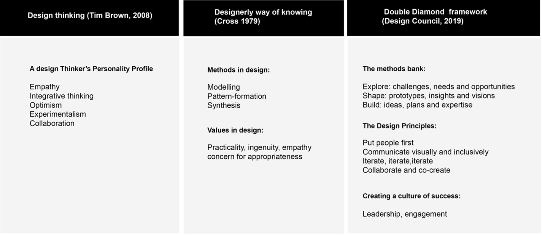 The second category comprises design frameworks working within non-design disciplines not easily or immediately associated with design, such as healthcare. One design thinking framework for healthcare management and innovation lists “empathy, radical collaboration and rapid prototyping [38],” another design frameworks highlights health design thinking is “human centred (empathy, co-design and determinants) and creative mindset (questioning, visualizing, prototyping and storytelling) [39].”