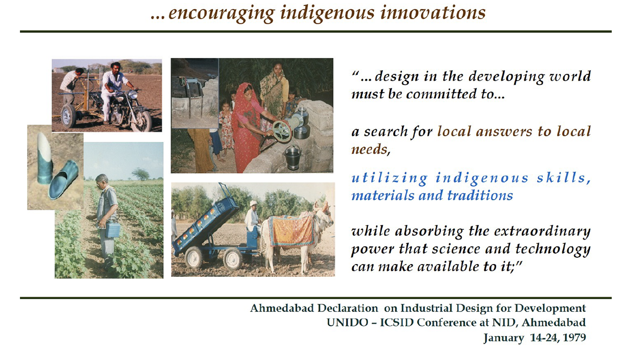 The Indian approach is predicated on a philosophy that treats individuals not as passive consumers but as active participants and co-creators within a shared socio-cultural ecosystem. This perspective was formally codified in the Ahmedabad Declaration on Industrial Design for Development, articulated at NID during the 1979 UNIDO–ICSID conference. The declaration emphasized “a search for local answers to local needs, utilizing indigenous skills, materials and traditions while absorbing the extraordinary power that science and technology can make available [4].” This vision aligns with Ezio Manzini’s concept of “cosmopolitan localism,” which posits that design, while informed by global knowledge, must remain deeply grounded in local contexts to maintain relevance and sustainability [5]. This declaration established a clear trajectory for India to forge its own path, creating a new grammar of design for development (Figure 2).