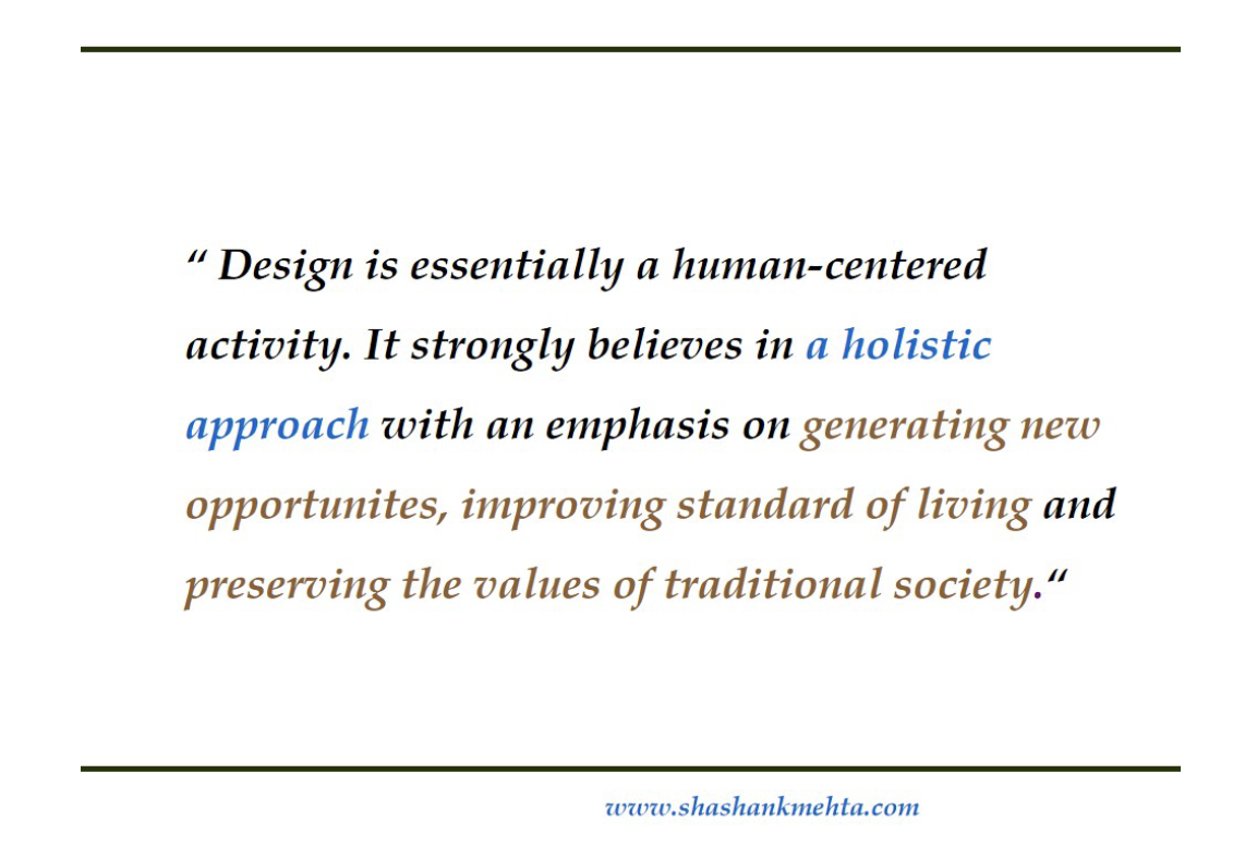Abstract: This paper provides a comprehensive examination of a design philosophy pioneered and institutionalized by the National Institute of Design (NID) in India. It is argued that for a nation as complex and multifaceted as India, a successful design methodology must be inherently linked to its distinct cultural heritage, economic realities, and foundational ethical principles. The analysis begins by exploring the profound influence of Gandhian philosophy—particularly its tenets of simplicity, self-reliance (swadeshi), and decentralized “production by the masses”—on this design framework. The paper then systematically delineates the core pillars of Societal Design: the promotion of indigenous innovation, the application of frugal engineering principles, and the strategic empowerment of micro, small, and medium enterprises (MSMEs) and the traditional crafts sector. By analysing NID’s role as a trans-disciplinary Centre of Excellence, this research demonstrates how Societal Design transcends conventional commercial objectives, positioning itself as a potent and people-centric catalyst for inclusive growth and sustainable national development.