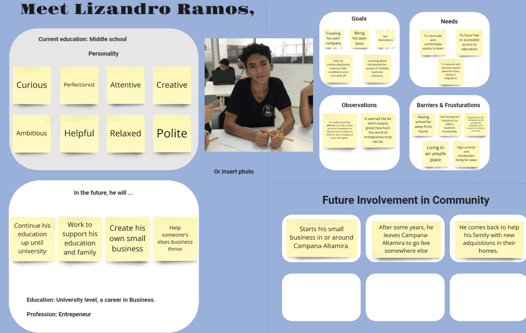 This tool was introduced after the first engagement with teenage participants from Campana-Altamira to deepen understanding of their potential development trajectories. In the follow-up workshop held approximately one month later, students from Tecnológico de Monterrey who had participated in the initial engagement were asked to complete the mapping exercise. This approach was designed to maintain continuity in insights while recognizing the limited time available for direct interaction with the community.
