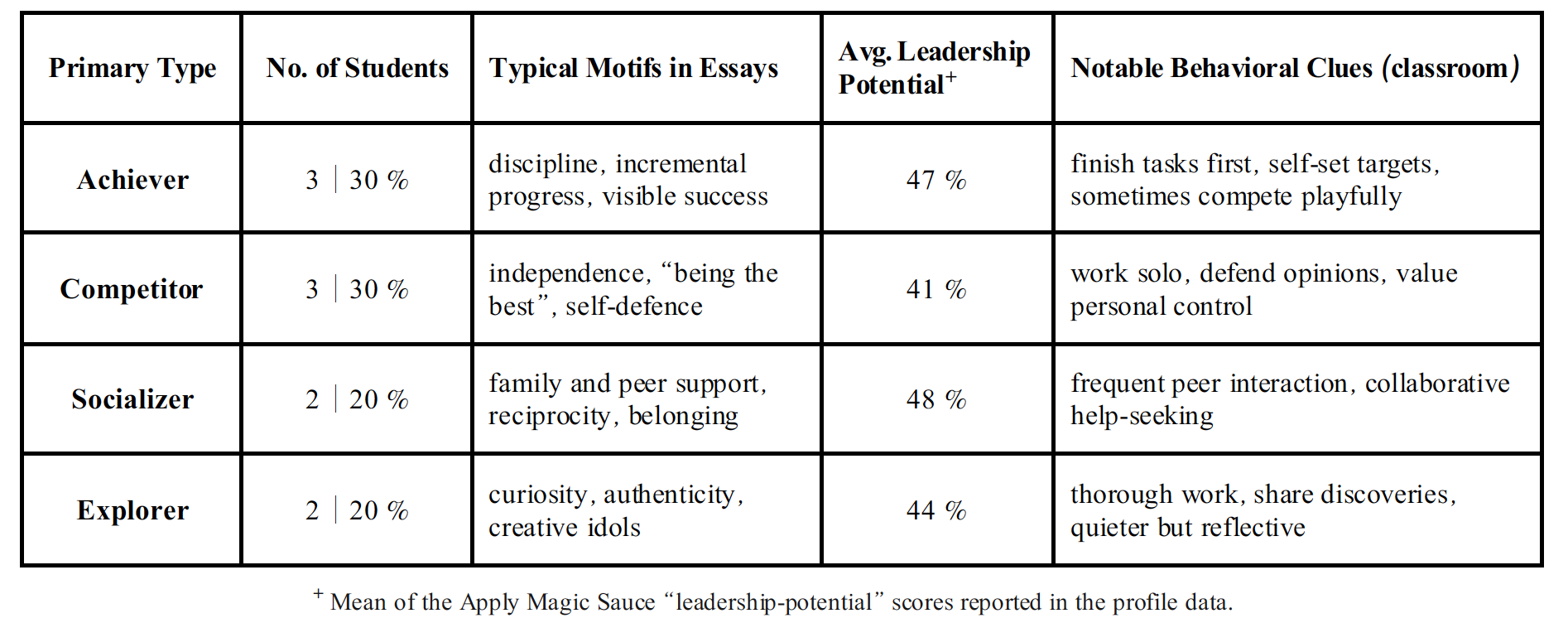 Average predicted leadership potential sits in the mid-40 %s, high enough to enlist students as data ambassadors yet low enough to profit from structured guidance. Competitors bring assertiveness; Socializers contribute facilitation skills; Explorers add novel framing; Achievers push momentum.’