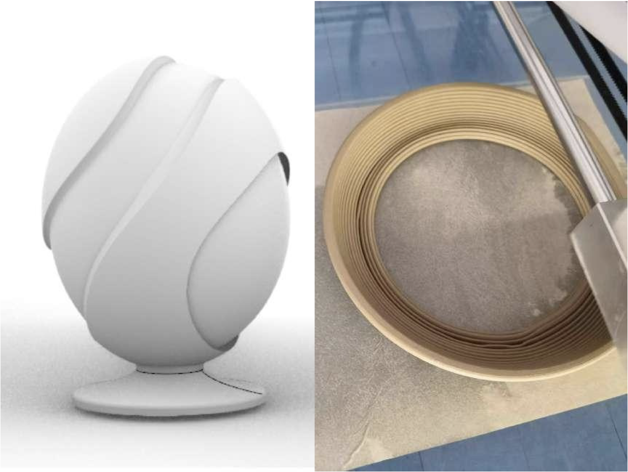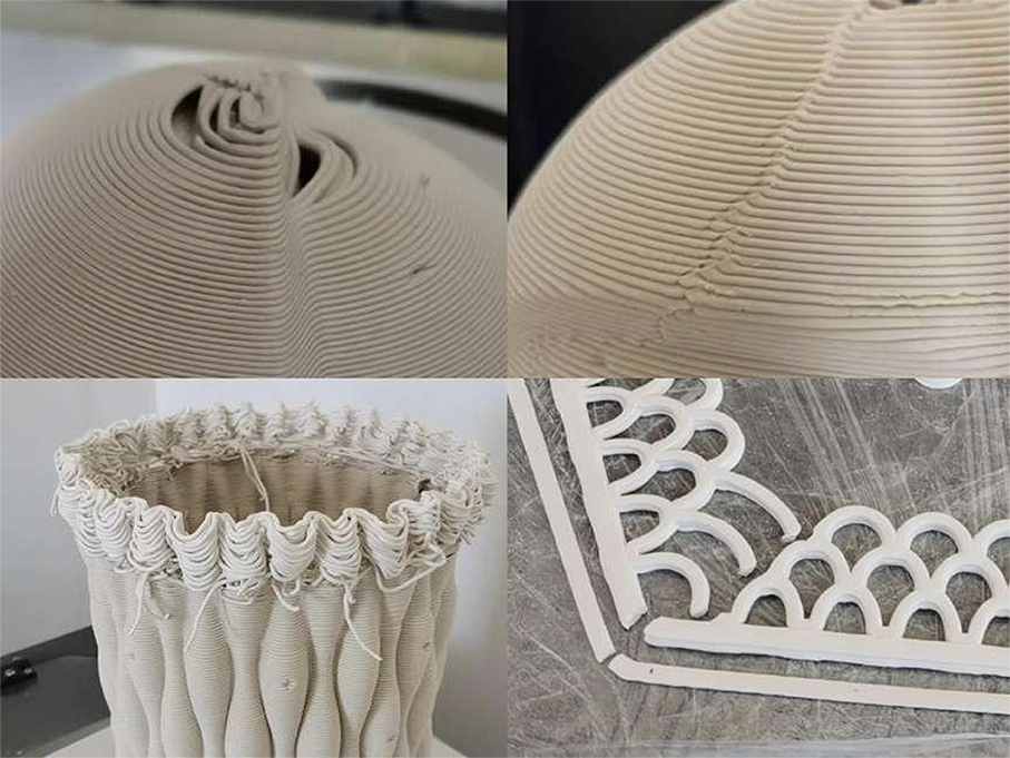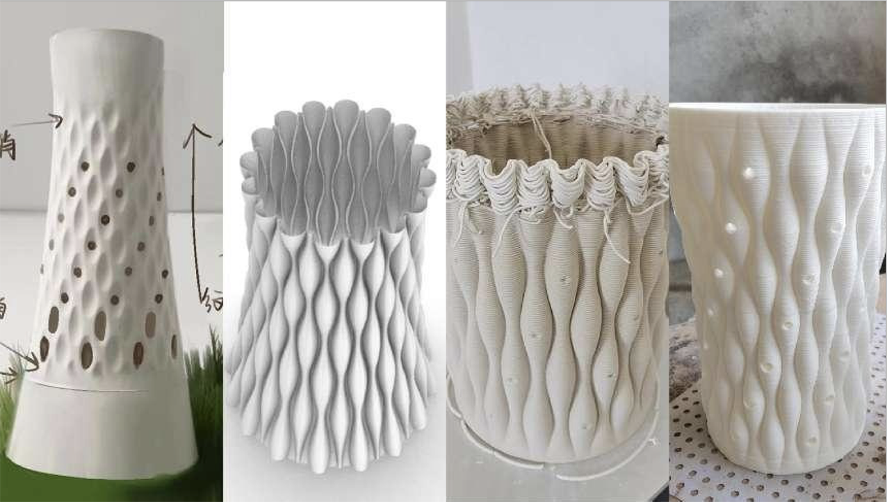 3D ceramic printing builds objects by continuously extruding clay coils through a machine, requiring uninterrupted material flow. As a result, product forms are typically cylindrical, with external form variations achieved through techniques such as parametric design.