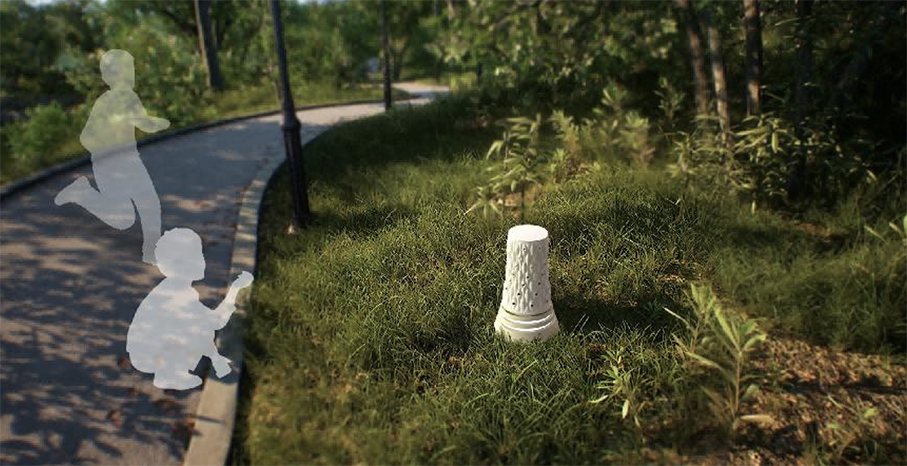 As part of the design’s aesthetic appeal derives from its material and fabrication, renderings alone cannot fully convey the product’s visual impact. The prototypes were therefore placed in roadside urban green spaces for video and photographic documentation (Figures 26, 27 and 28).