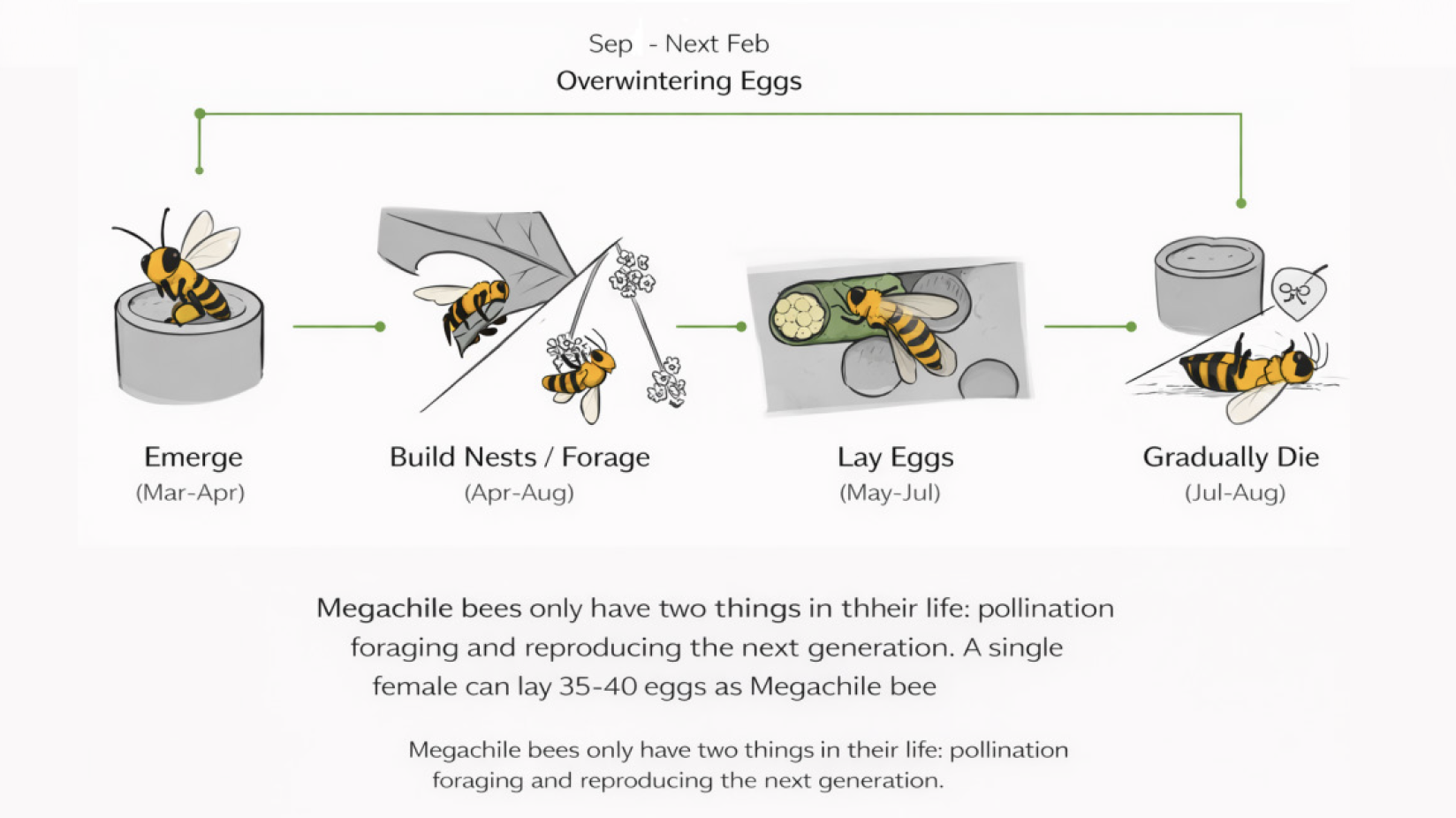 The foraging range of solitary bees is approximately 62 to 154 meters. The main nectar-collecting season occurs from April to August, with bees typically emerging in spring and remaining active throughout the summer. Therefore, it is important to ensure that a diversity of flowering plants with staggered bloom periods is available within their foraging range.
