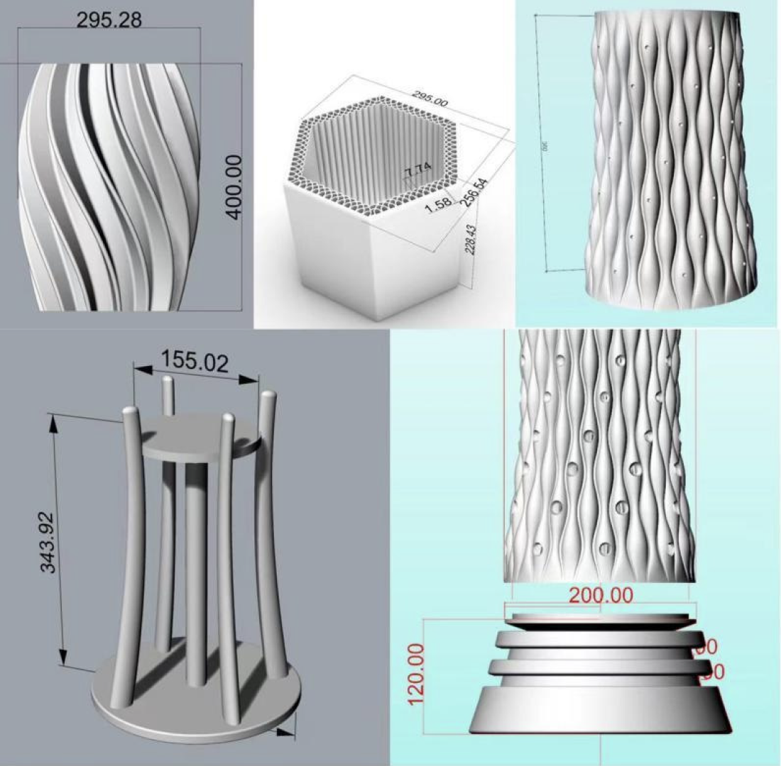 Because this design employs 3D ceramic printing, the products require firing, which causes shrinkage. The shrinkage rate cannot be precisely determined, as it is affected by the clay material, kiln temperature, and the placement of the product during firing. The clay material currently used has an approximate shrinkage rate of 17%. The base dimensions also need to be slightly adjusted according to the post-firing size. The final dimensions of the fired models, from largest to smallest, are approximately 663 mm × 155 mm × 155 mm, 440 mm × 200 mm × 200 mm, and 244 mm × 212 mm × 190 mm (Figure 23).