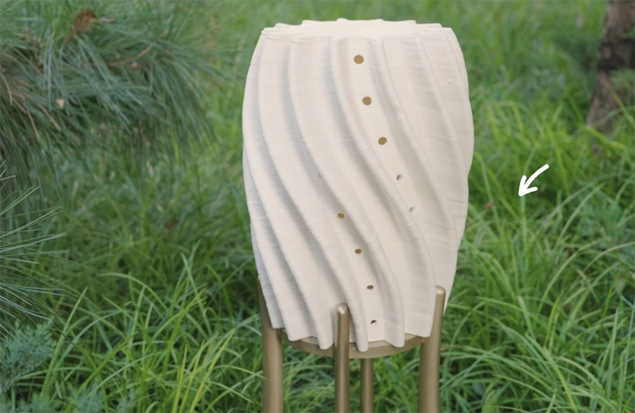 The series consists of three works primarily divided into two structural types. The first type is a hollow, capped cylindrical form, with perforations on the exterior surface into which natural wheat straw tubes are inserted to simulate the natural environment. This design aligns with the natural preferences of solitary bees, providing suitable reproductive nests. The second type is a bottom-sealed basin form that does not require additional materials; the vertical tubular structure is formed directly through printing, making it more compatible with the fabrication process. However, this approach has the drawback of water accumulation and is therefore more suitable for semi-open balconies or outdoor spaces with a canopy (Figures 20a, 20b, 21, and 22).