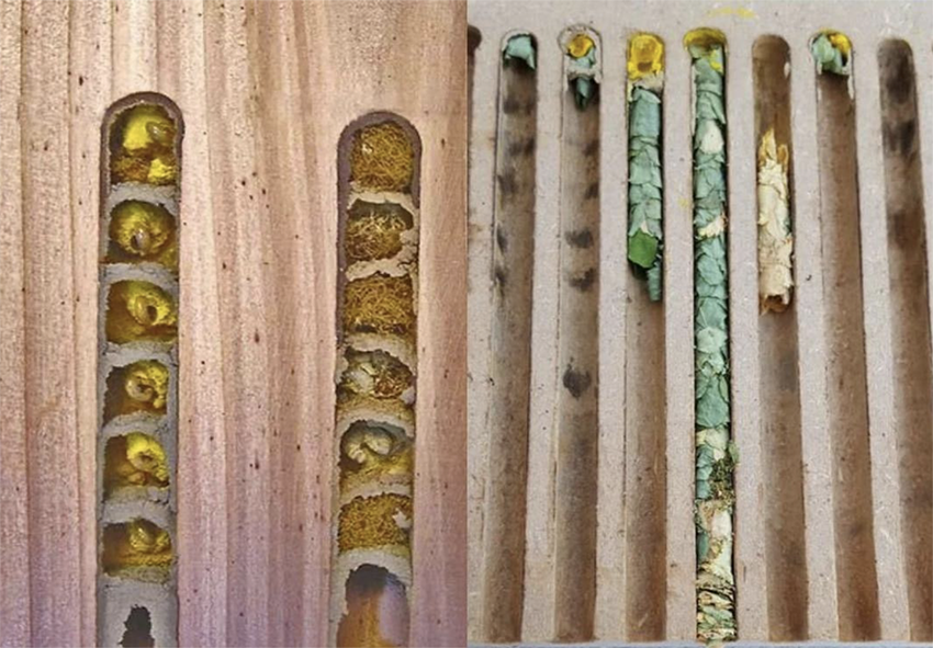 Solitary bees exhibit material preferences when selecting nesting sites. Wooden nest boxes are the most attractive to bees, while hollow plant stems, such as reed stems, also serve as suitable alternatives. Some cases have employed concrete or extruded polystyrene for nest construction.