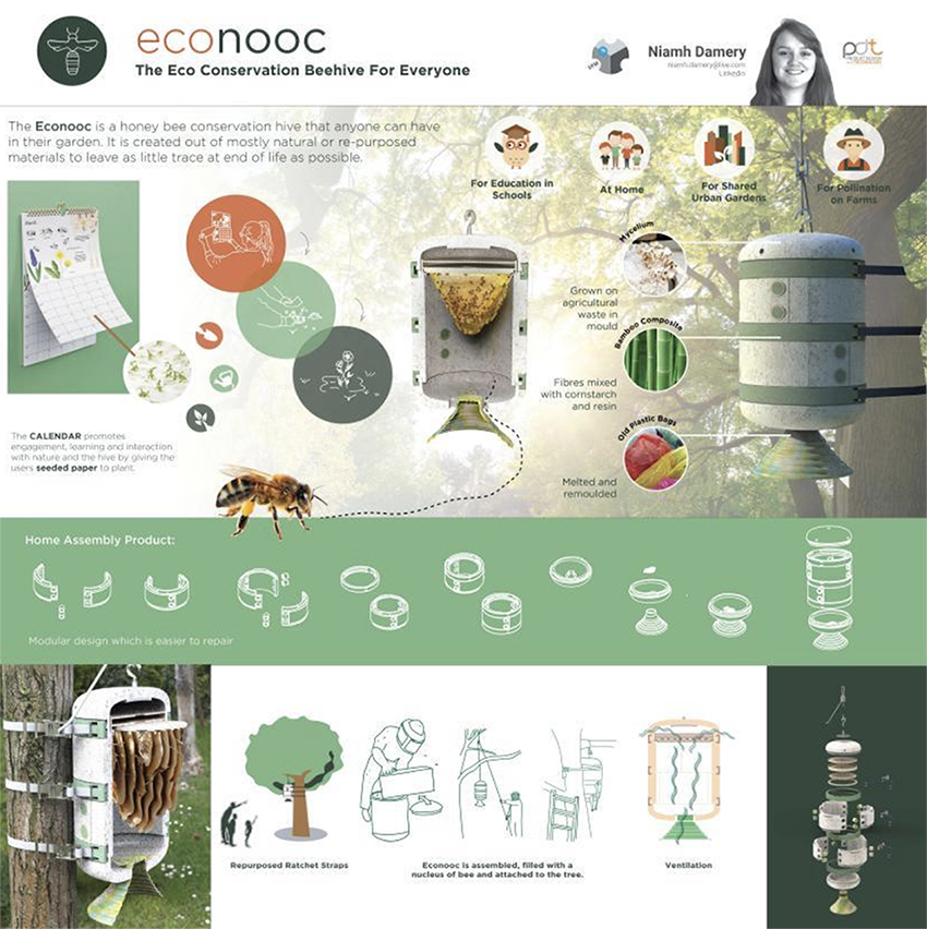 This design uses mycelium and other sustainable materials to construct bee nests (Figure 8). It features a plant calendar that guides users to grow seasonal wildflowers in their gardens, supporting their own bees and promoting biodiversity awareness. Although this design targets social bees, it still provides useful references for solitary bee conservation.