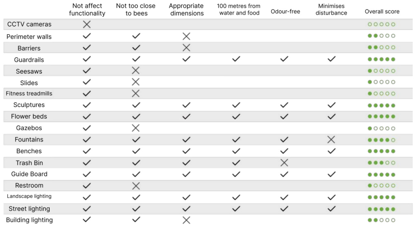 In selecting types of public facilities, the author applied the following criteria: the facility’s primary function must not be affected, the bees should not be overly disturbed, the size and height should be appropriate, the facility should be within 100 meters of water and food sources, and it should not emit odors or otherwise excessively interfere with the bees. Based on these criteria, streetlights, benches, signboards, fountains, traffic signs, sculptures, and drinking stations were selected as the focus for design development.