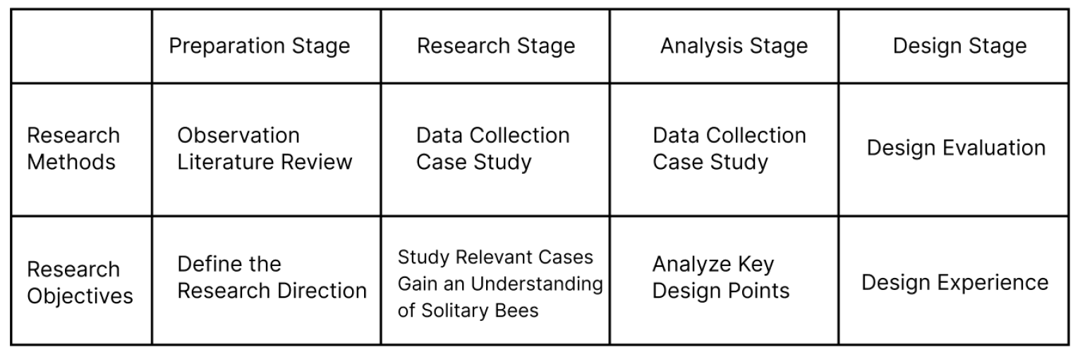 Different research methods were employed at various stages of this study, as shown in Table 1. As the design target is animals rather than humans, the investigation primarily relied on indirect research approaches.