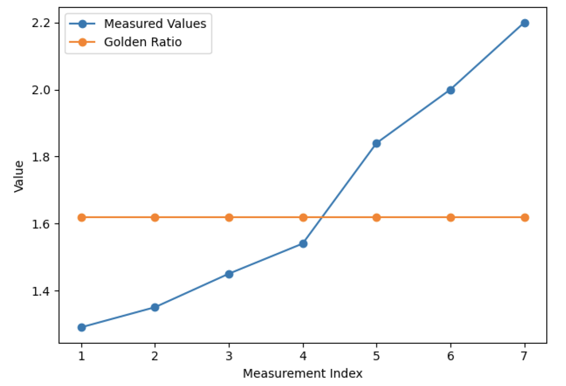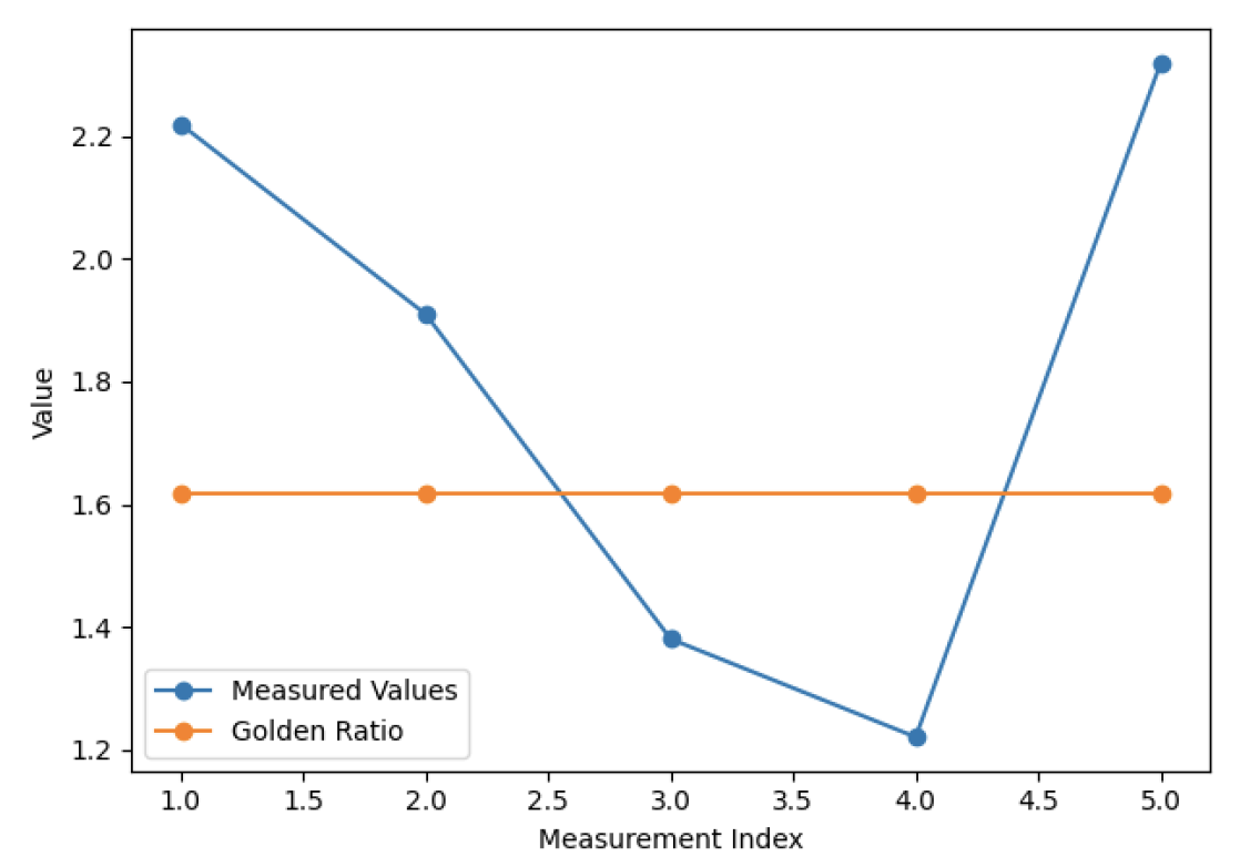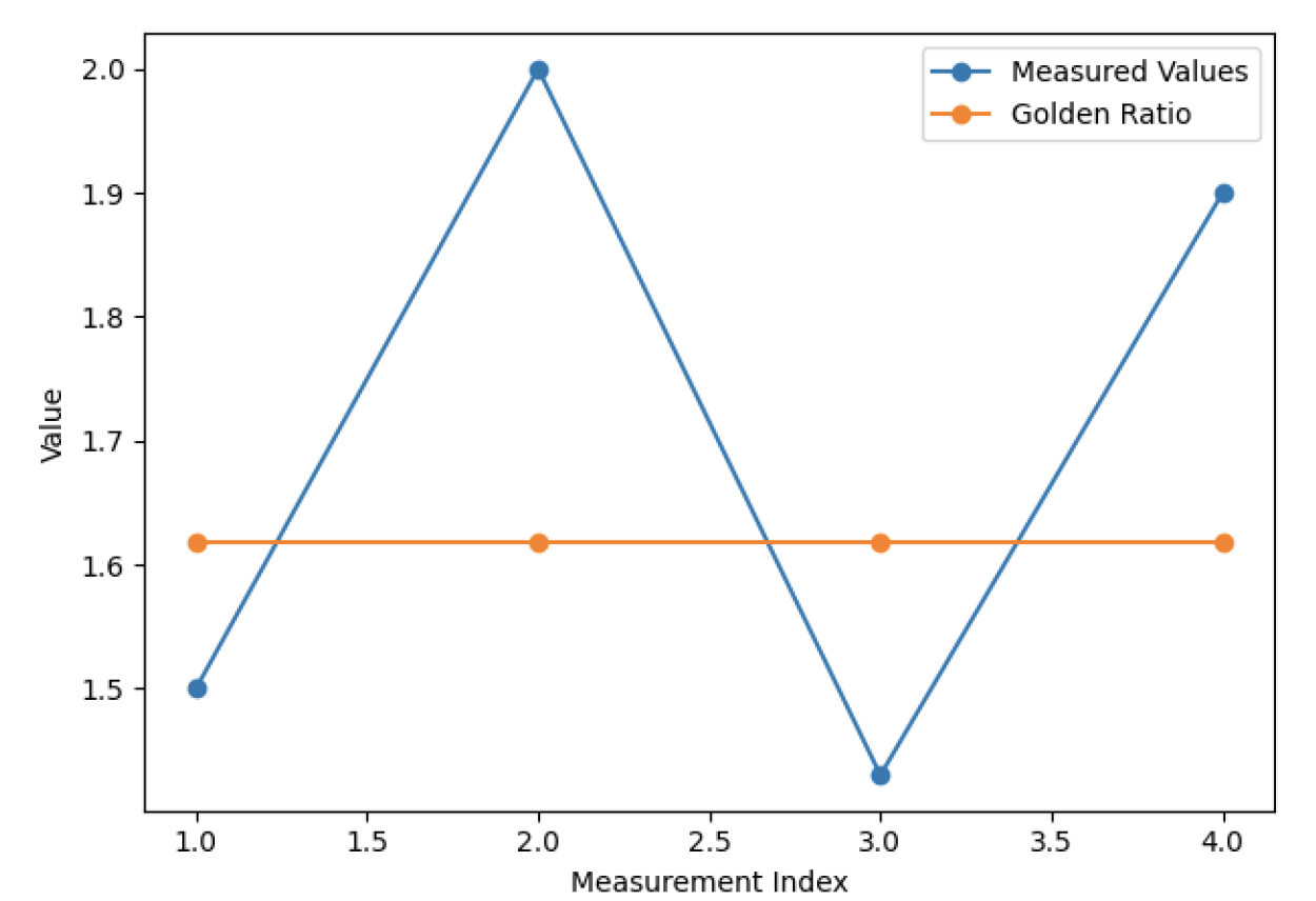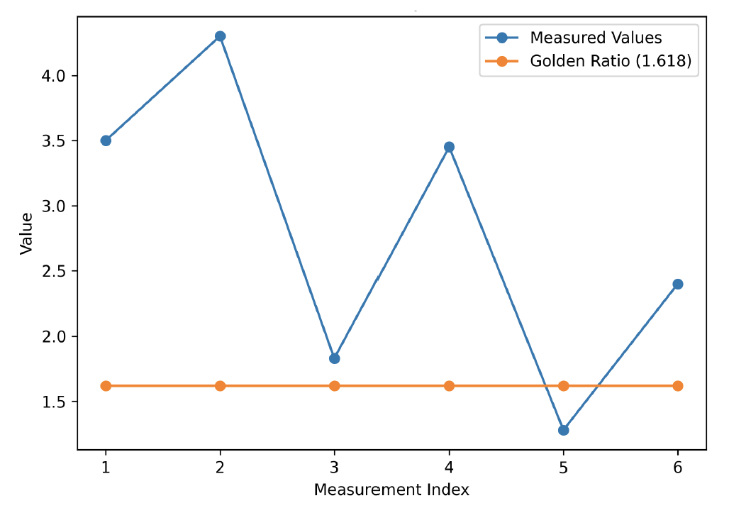 A line graph comparing the measured proportions of the Jaleyb motif with the golden ratio (1.618). The results indicate that all measured values deviate from the golden ratio, with no proportion closely approximating it (Figure 15).