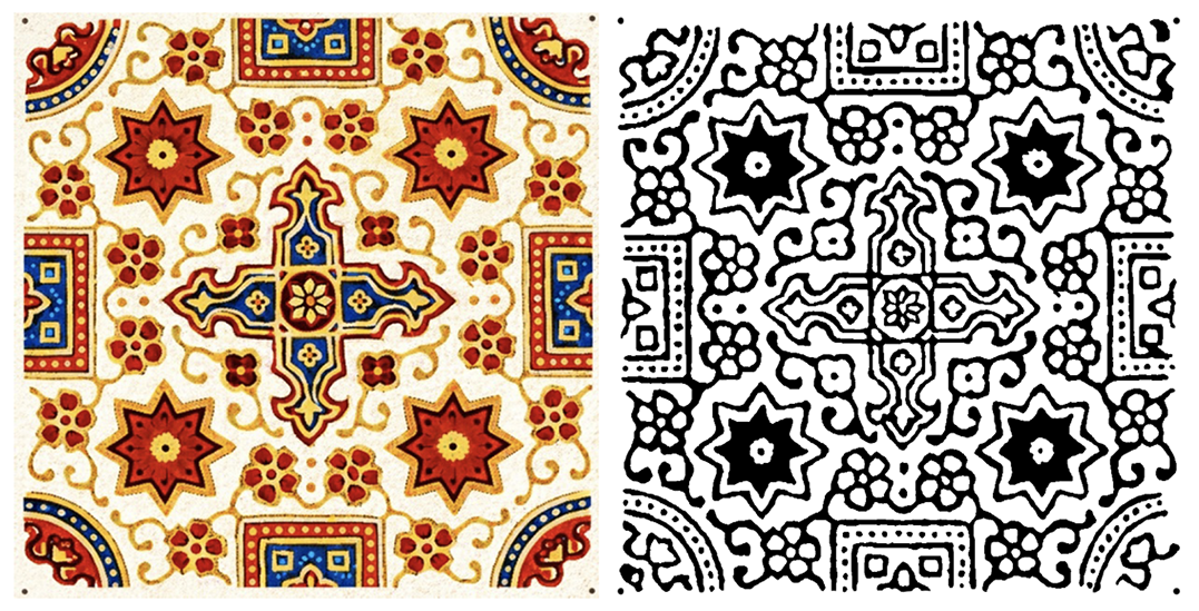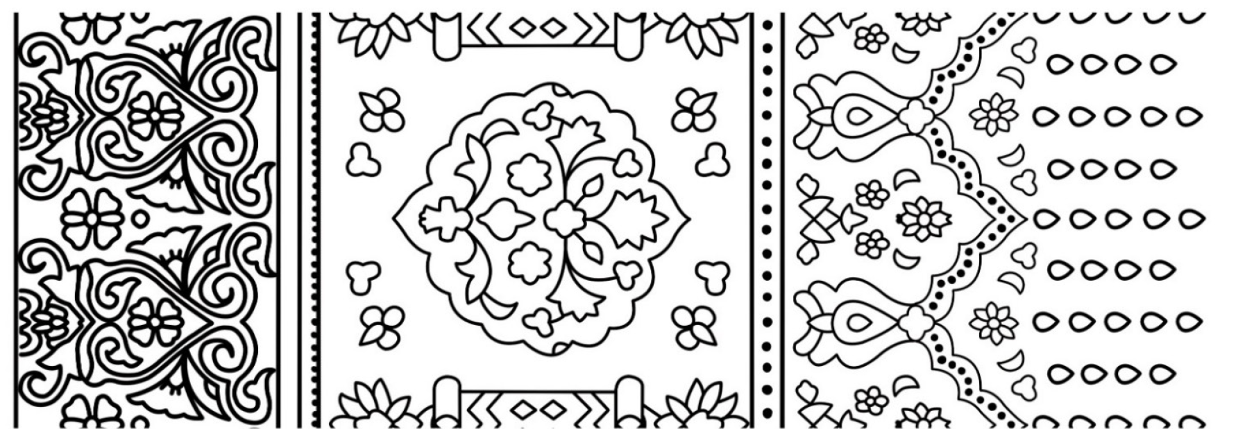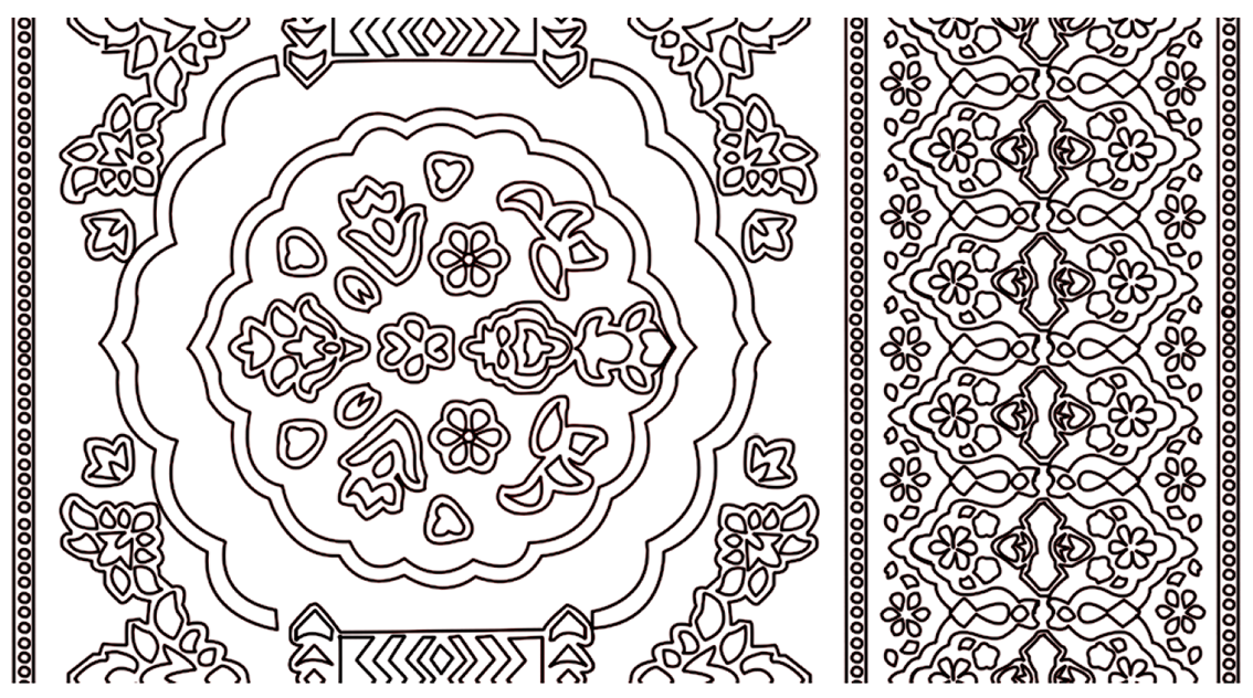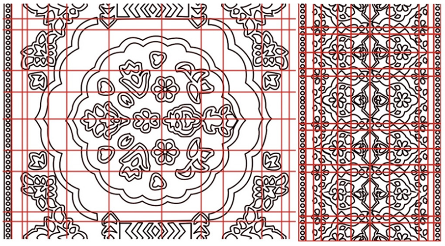 There was a study of radial symmetry (rotational symmetry) whereby the motif elements were rotated around the hub. For example, if a motif had a star-like shape (Figure 3), one segment or petal was similarly rotated by the theorized angle (e.g., 60°) to check a six-fold rotational symmetry to ensure that the same shapes would recur in a complete circle. The fundamental repetition of every pattern was determined by cutting out one repeat of a given pattern (one unit of a border repeat, one quarter of a larger medallion in the middle) and confirming that this repeat was reproducible by those repeating the entire pattern. This process was performed with vector drawings; with Illustrator, single units of motifs could be cloned and tiled or turned to experiment with the repeat pattern (Figures 2, 7, 12, 17, 22, and 26). The process was made possible by a digital ruler and grid, which guaranteed the consistency of the measurements of the spacing and alignment of the repeats. The complex interweaving of shapes and flowers of the motifs was simplified to geometric primitives (e.g., concentric circles, stars, and interlocking polygons), and its structure was charted with respect to symmetry acts (axes of reflection or rotation degrees). This methodological procedure adheres to the traditional research on symmetry in textile design, where the boundaries of motif shapes are defined, and a set of symmetry axes is created to separate the motifs into congruent pairs. Every symmetry (e.g., whether a border had a two-fold mirror symmetry or a central motif had four-fold rotational symmetry) was noted in the geometric profile of the motif.