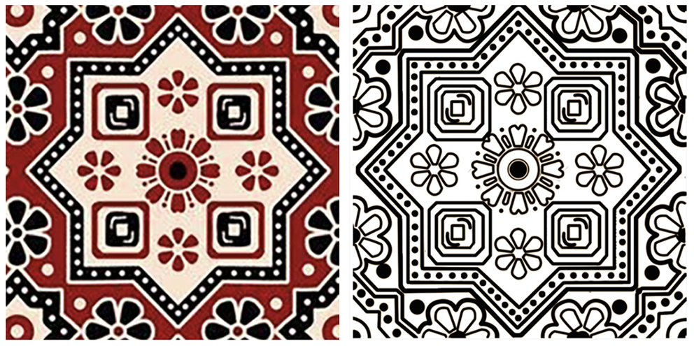 Using the prepared overlays (Figures 4, 9, 14, 19, 23, and 27), all the selected motifs were graphically dismantled into their essential parts, and the characteristics of their symmetry were recorded. The methods used to analyze the design were the principles of art visual analysis, visual structure, and composition (points, lines, shapes, and their symmetry). Each motif was balanced by a straight line through the center of the motif or other symmetrical axes, which were drawn using the Photoshop guide tool on top of the axes of symmetry (Figures 3, 8, 13, and 18). Bilateral symmetry was also explored by inserting a vertical and/or horizontal axis in the middle of the motif and determining whether the two sides of the mirror were coincident with each other. Digitally, one half of the motif was equivalently mirrored (flipped) across the axis to ensure that it was similar to the other half of the motif.