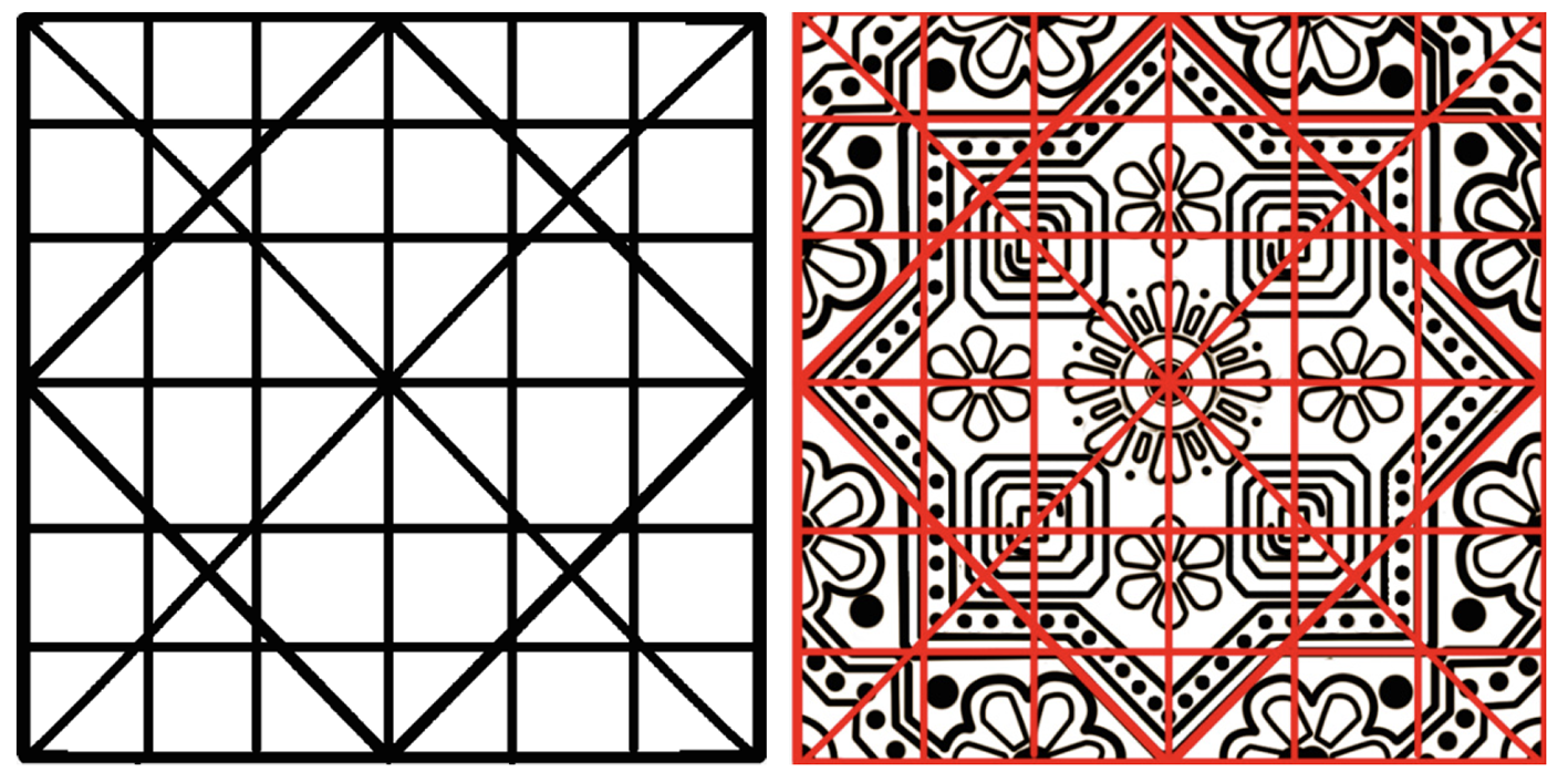 Adobe Photoshop CC and Illustrator CC (Adobe Inc.) were used to analyze all image data. High-resolution images (Figures 1, 6, 11, 16, 21, and 25) were imported into the Photoshop application to enable close examination of the guides and exact overlaying (Figures 4, 9, 14, 19, 23, and 27). The software had a calibrated reference grid and rulers that could be enabled to enable scale drawing and ruler-based measurements on the images. The points of each motif (e.g., the middle of a circle, the tip of a star petal, and the corners of a repeat unit) are indicated on different digital layers (Figures 3, 8, 13, and 18). Making an inspired use of the digital overlay feature of the photographed motifs, the basic geometric elements (circles, polygons, and lines) were sketched using digital drawing tools of Illustrator, which essentially created a clean and geometric recreation of each design. This procedure enabled the researcher to determine the underlying geometric structures with high accuracy.