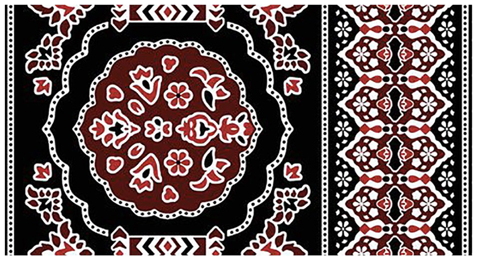 The iconography and geometry of the Ajrak motifs are also crucial. Previous research has stated that Islamic art has influenced the design philosophy in Ajrak, where abstract, repetitive elements and symmetry have been employed instead of figurative imagery [5]. The majority of Ajrak patterns are therefore symmetrical, featuring stars, rosettes, trefoils, and other geometric patterns, often arranged in concentric patterns around the central field (jaal), which is a net-like pattern formed by interconnected motifs that create an overall sense of balance and unity to the edges (wat), the directional pathway or layout line that guides the placement and flow of motifs across the fabric in Ajrak refers to the directional pathway or layout line that guides the placement and flow of motifs across the cloth. These designs are characterized by radial symmetry (repeating around a center) and bilateral symmetry (mirror-image reflections), giving the impression of balance and infinity in their composition. Each motif has a meaning: the incessant interweaving patterns are often seen as signs of the cosmic order, fertility, and spiritual unity with nature. Cultural symbolism is overloaded in Ajrak color; indigo blue, earthly red, white, and black are all combined to symbolize the elements of the Sindh environment and heritage [6].